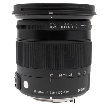 This Sigma 17–70mm f/2.8–4 DC is in excellent cosmetic condition with faint handling wear found throughout; please see photos for visual reference. Cosmetically, this lens has been rated at a (9+) condition. This lens is in proper working order; the zoom and focus rings turn smoothly, autofocus is accurate, and the glass is clean and clear with no signs of fungus, haze, or marks present. This lens includes front/rear caps and hood.