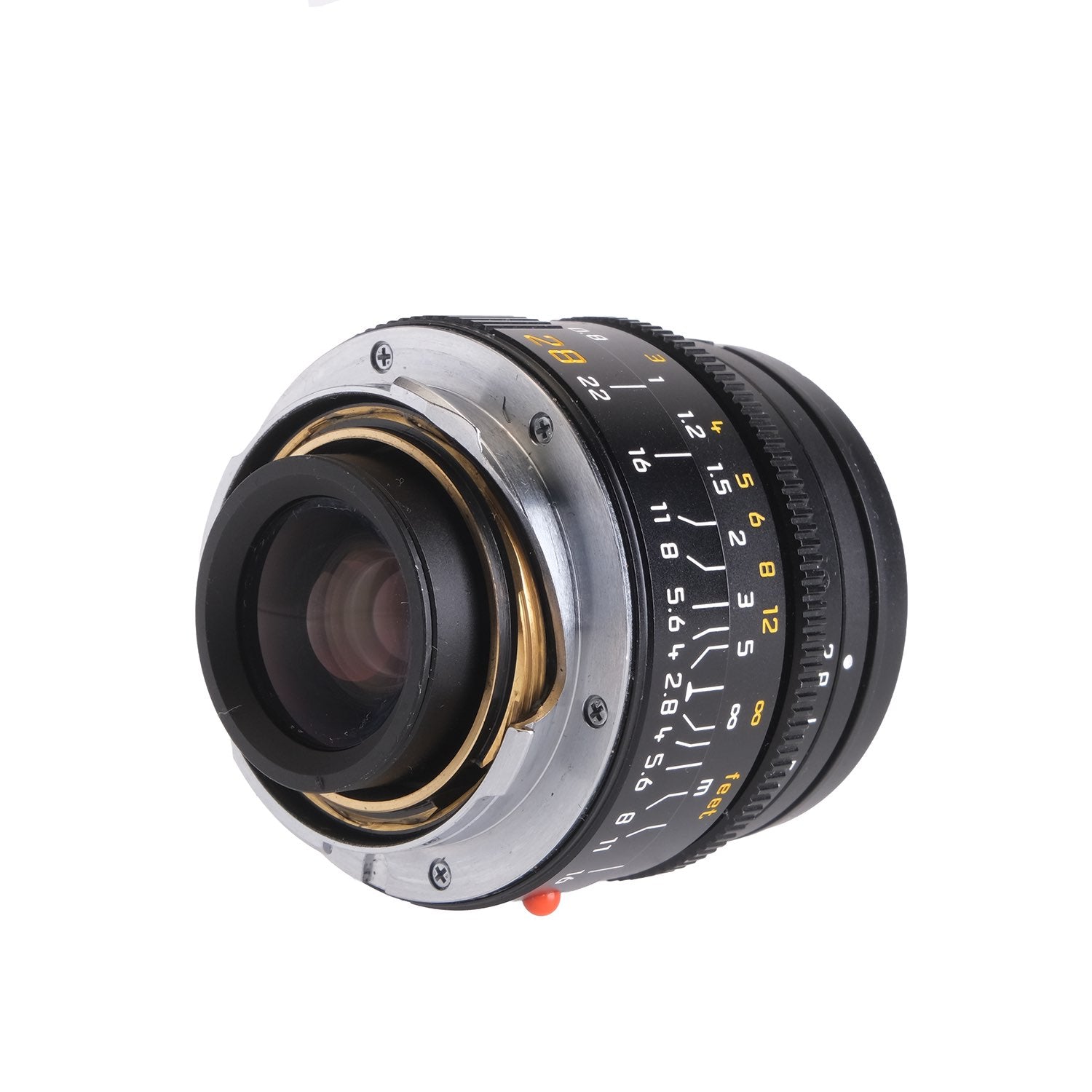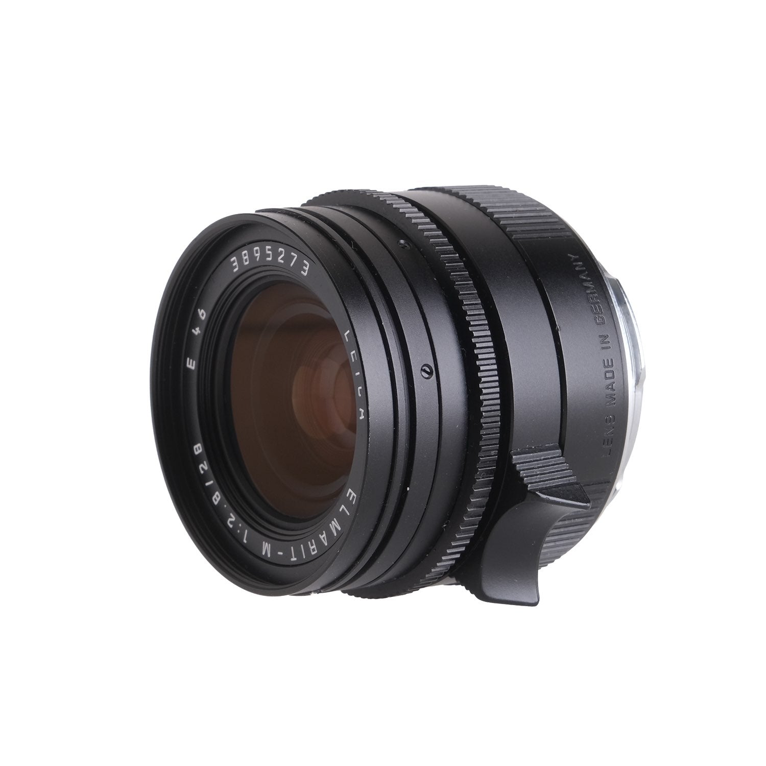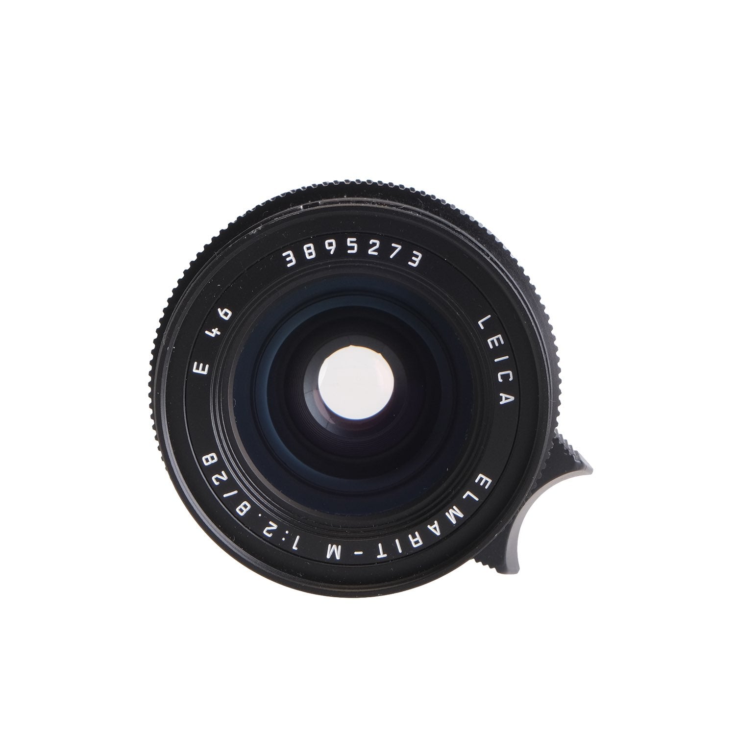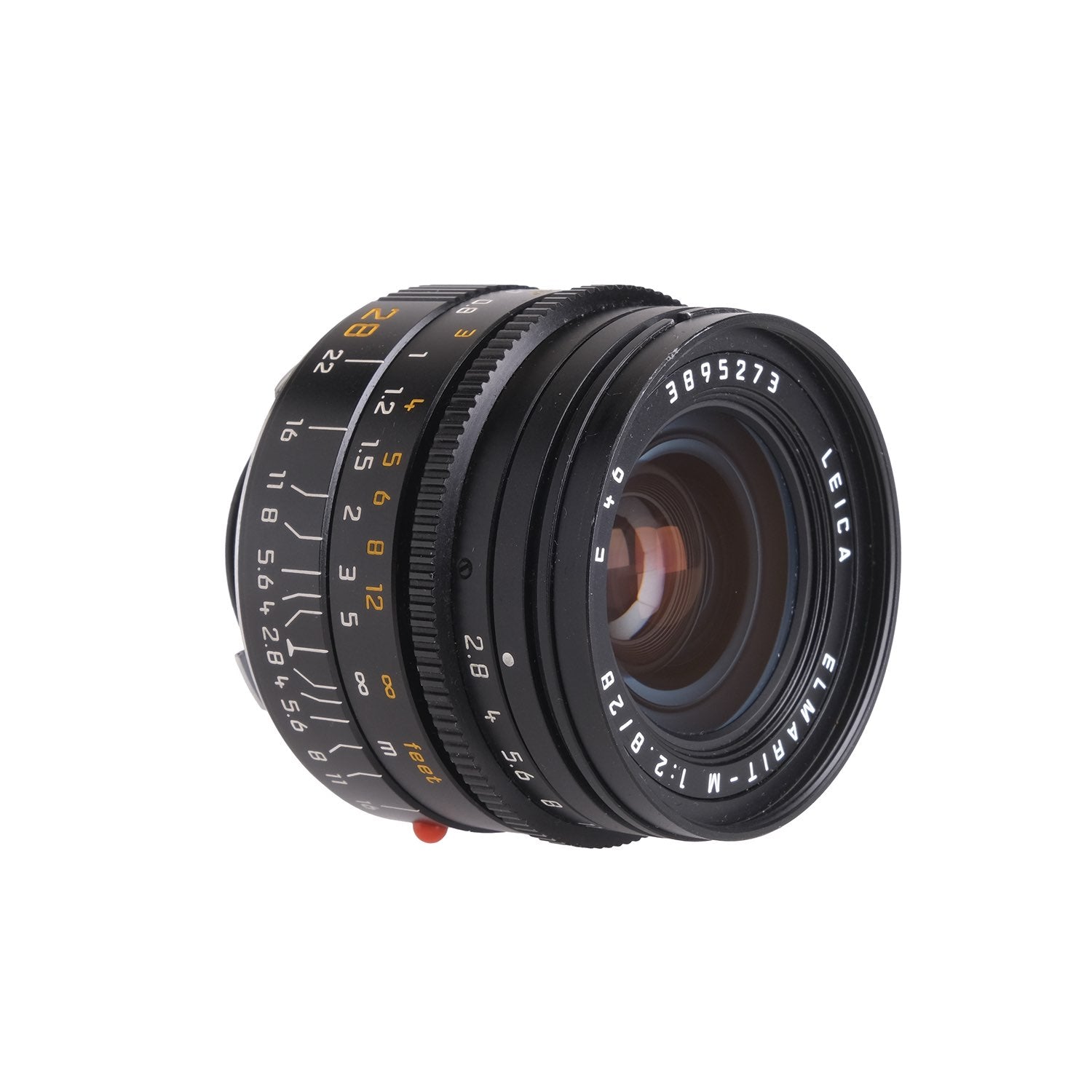 This Leica 28mm f2.8 Elmarit-M lens #3895273, is in average cosmetic condition with minor signs of handling wear found throughout, please see photos for visual reference. Cosmetically, this lens has been rated at a (9) condition. This lens is in proper working order; the aperture and focus are smooth, and the glass is clean and clear with no signs of fungus, haze, or marks present. This lens comes with the box, leather case and rear cap only. This lens is ready for use!