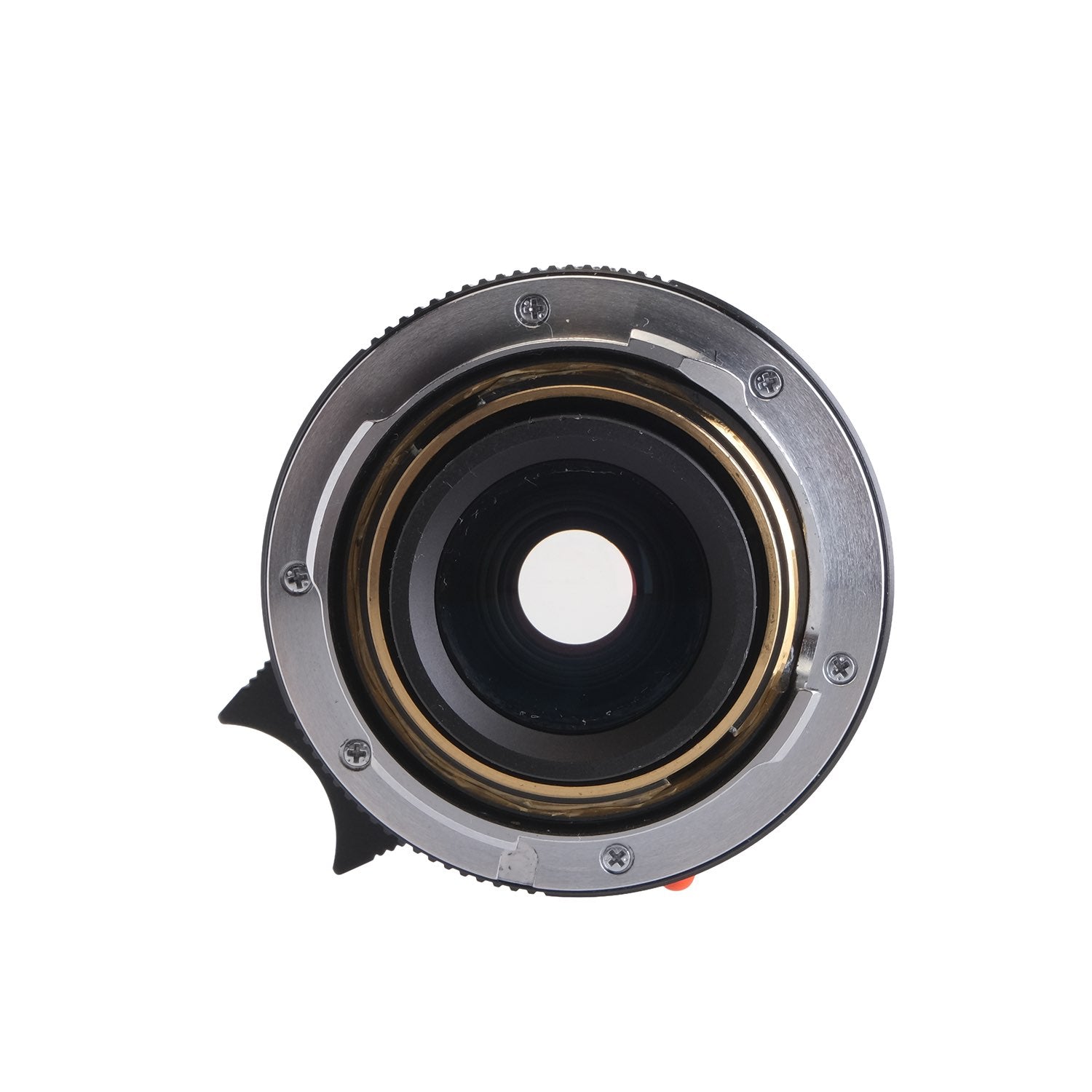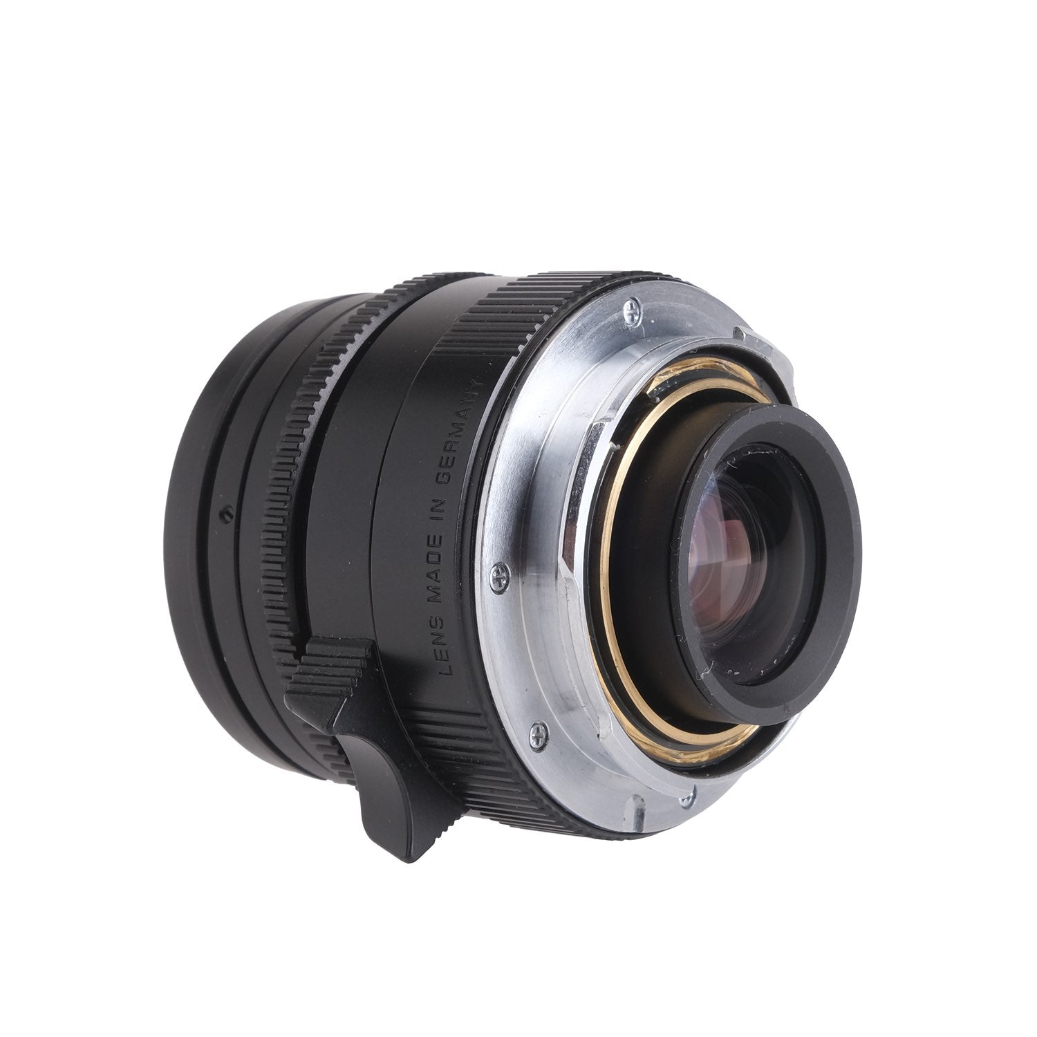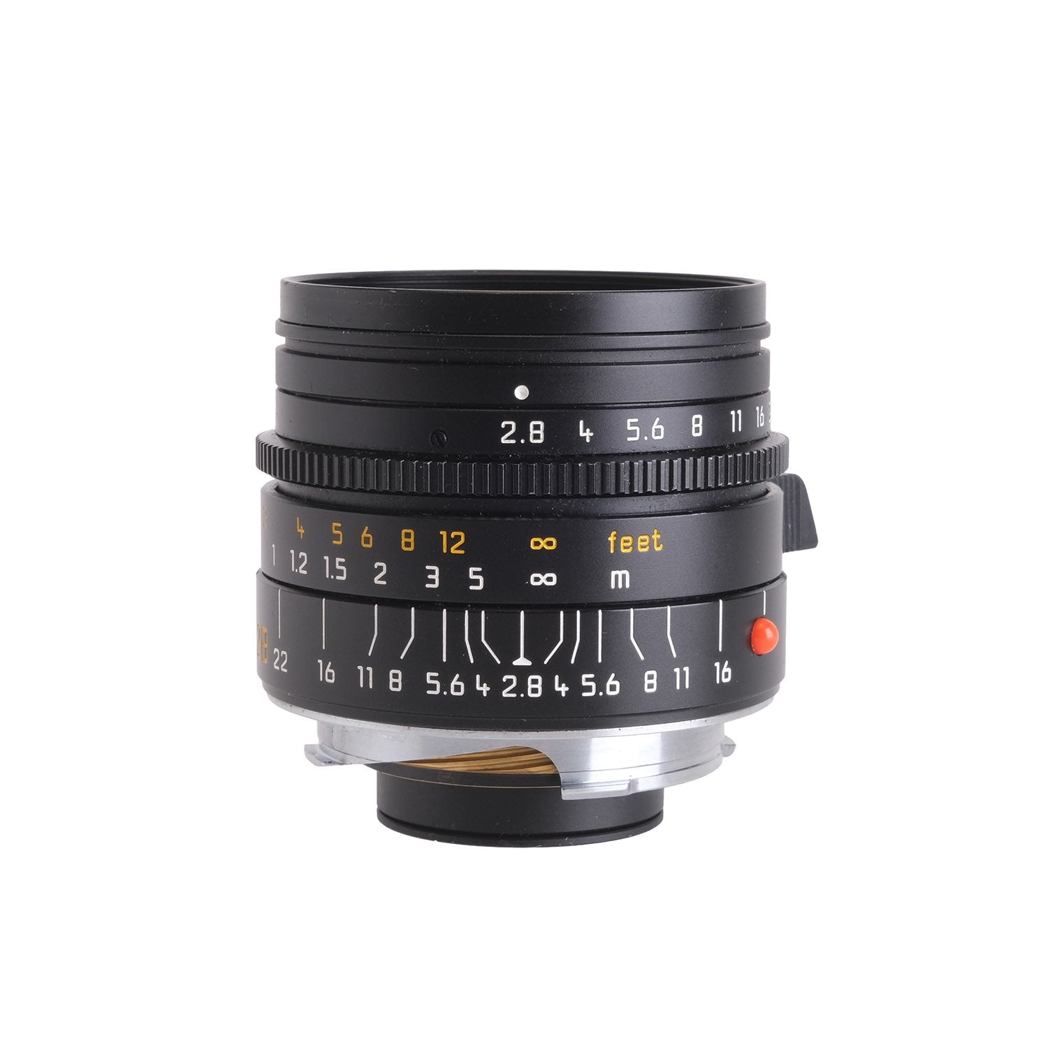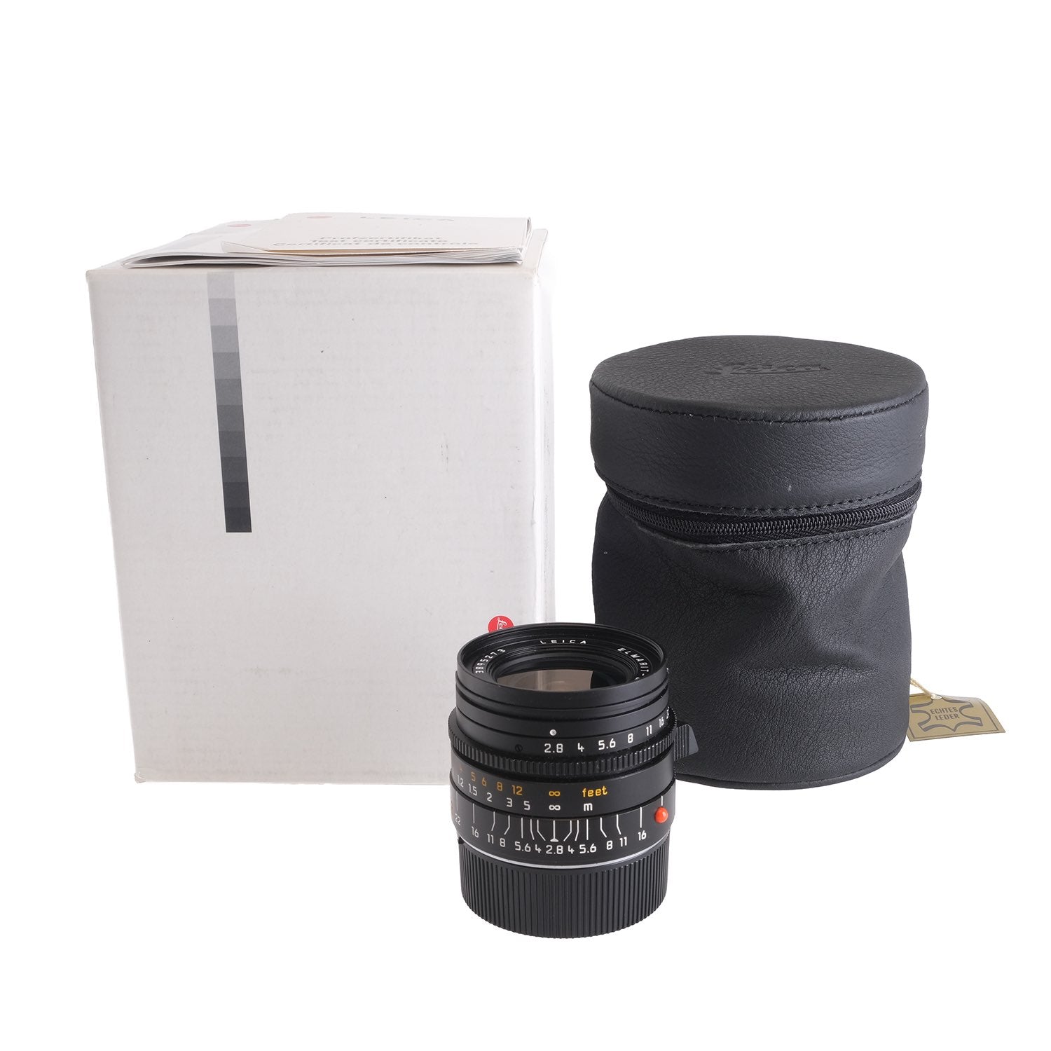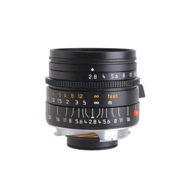 This Leica 28mm f2.8 Elmarit-M lens #3895273, is in average cosmetic condition with minor signs of handling wear found throughout, please see photos for visual reference. Cosmetically, this lens has been rated at a (9) condition. This lens is in proper working order; the aperture and focus are smooth, and the glass is clean and clear with no signs of fungus, haze, or marks present. This lens comes with the box, leather case and rear cap only. This lens is ready for use!