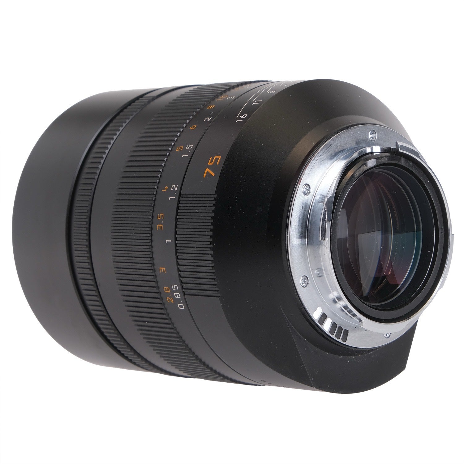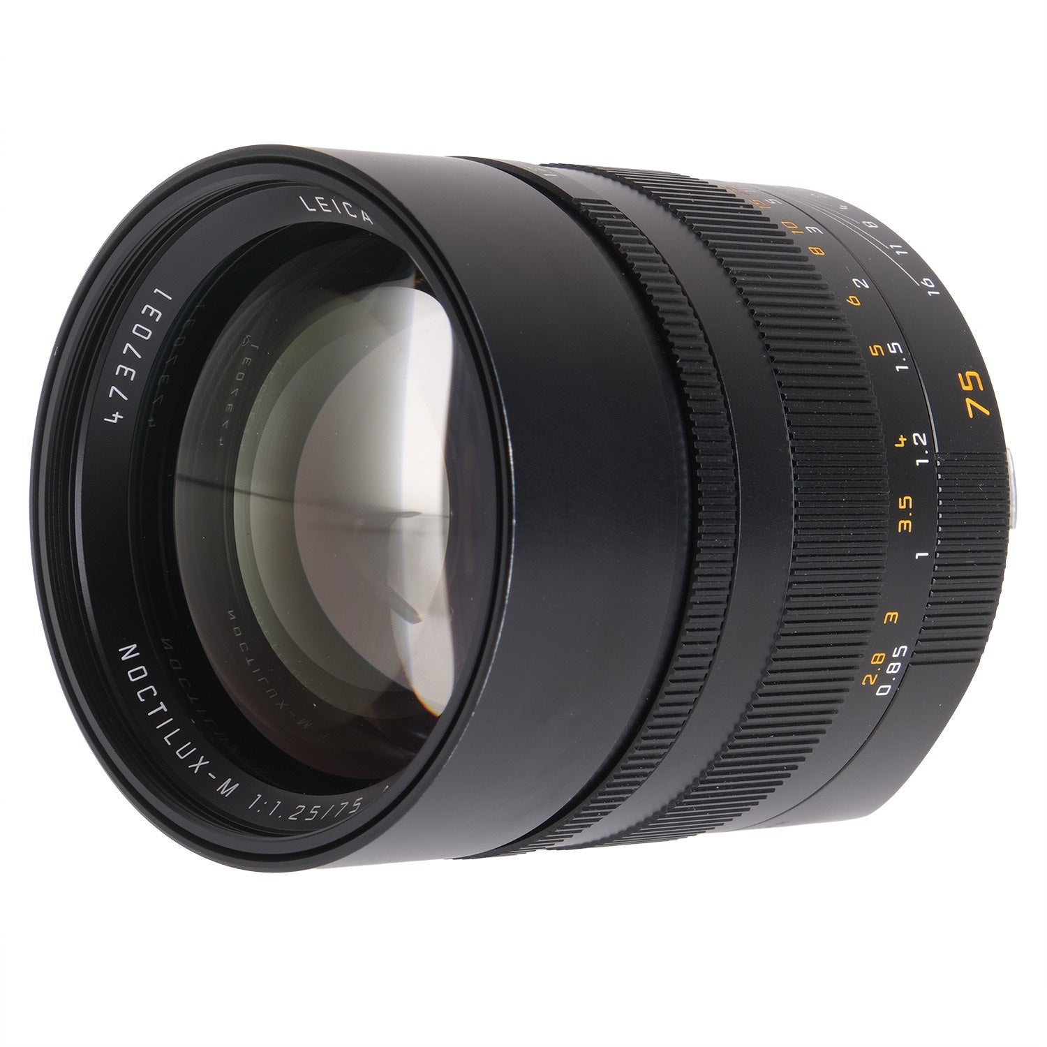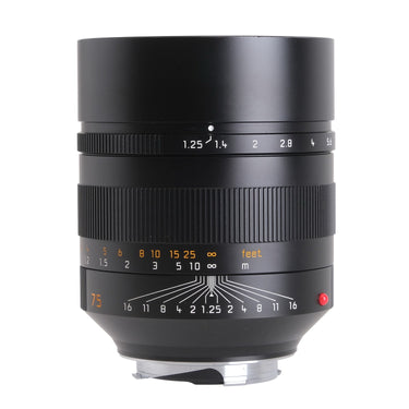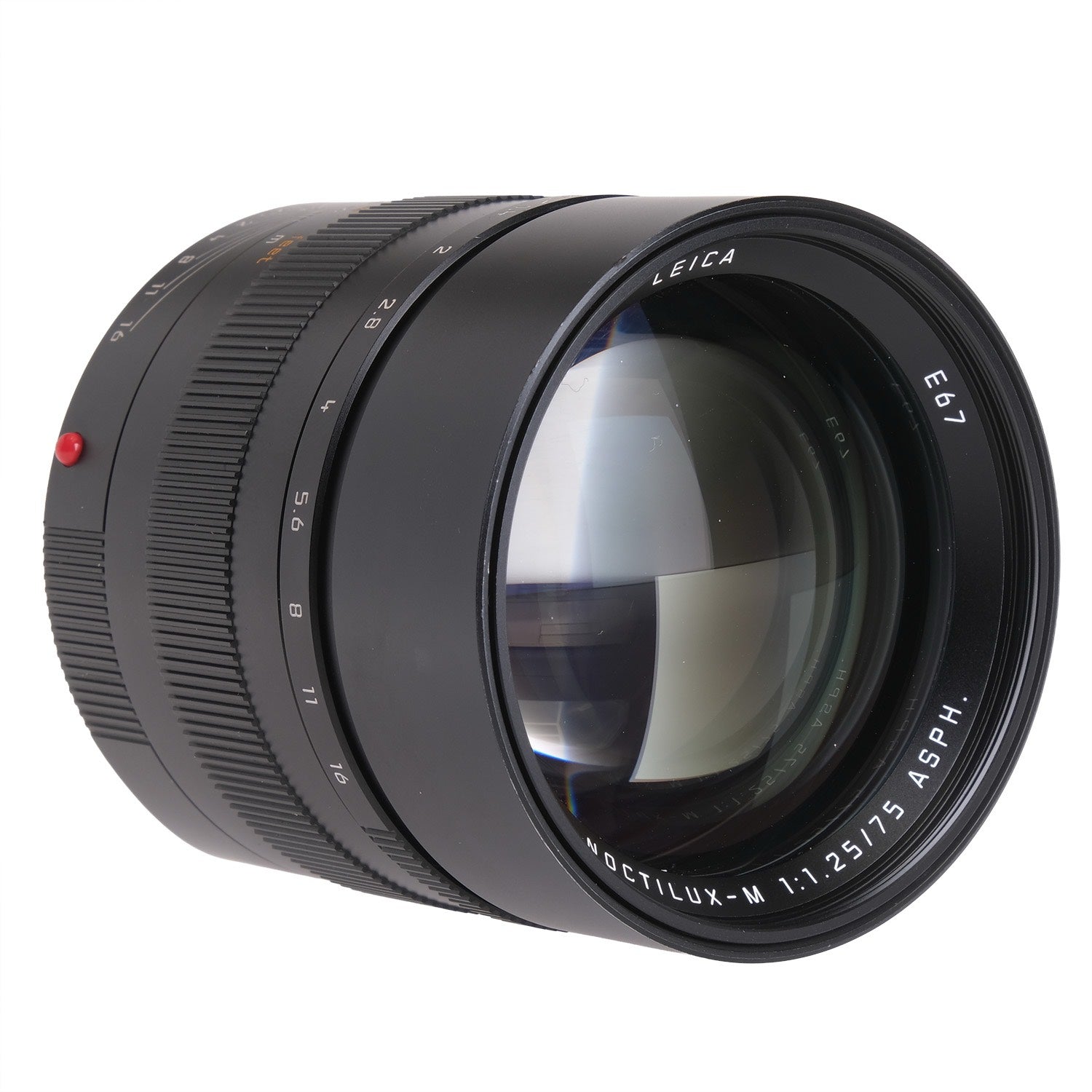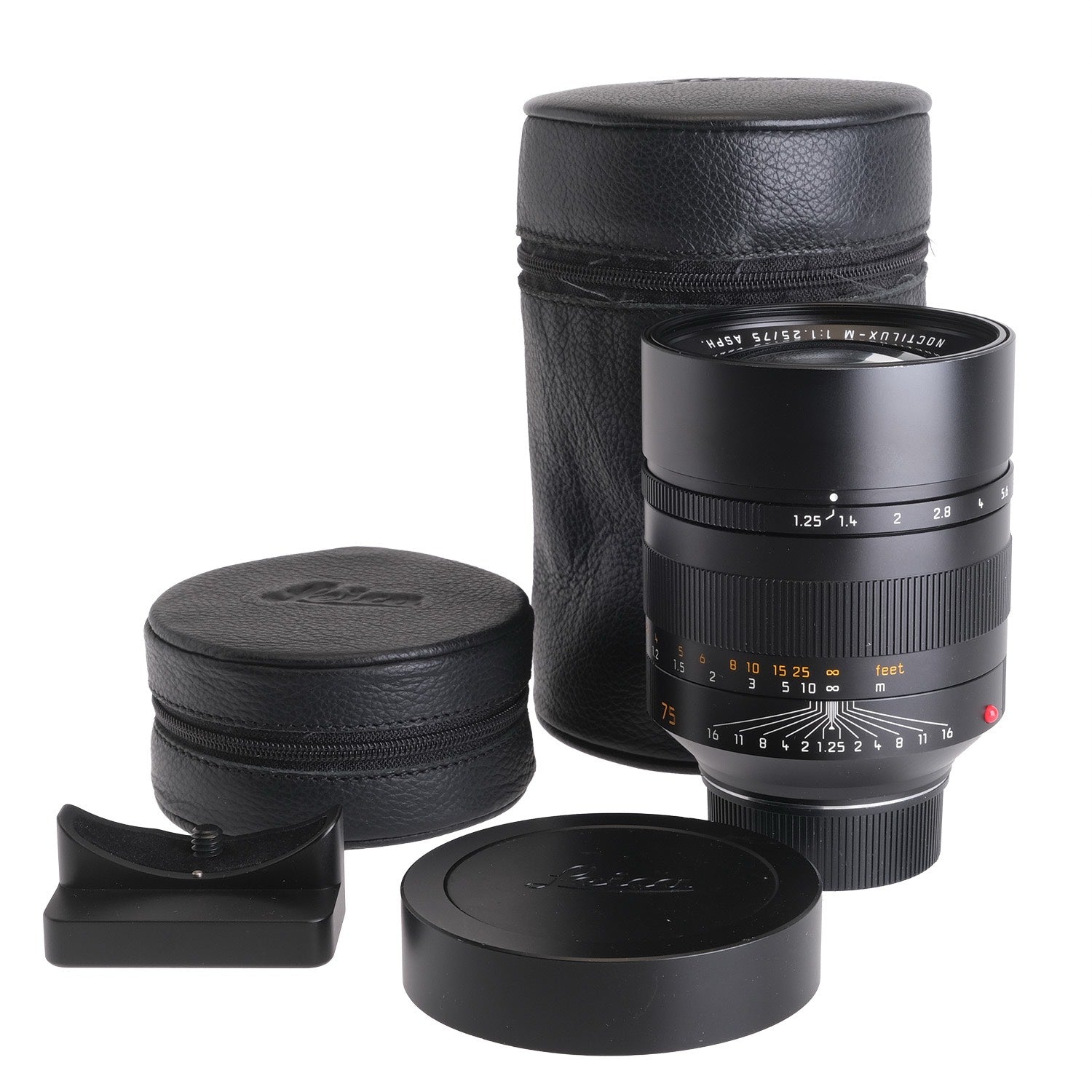 This Leica 75mm f1.25 Noctilux-M ASPH Lens #4737031, is in very good cosmetic condition with minor signs of handling wear found throughout, please see photos for visual reference. Cosmetically, this lens has been rated at a (9) condition. This lens is in proper working order; the aperture and focus turn smoothly, and the glass is clean and clear with no signs of fungus, haze, or marks present. This lens comes with a leather case, a tripod adapter, front cap, and rear cap. This lens is ready for use!