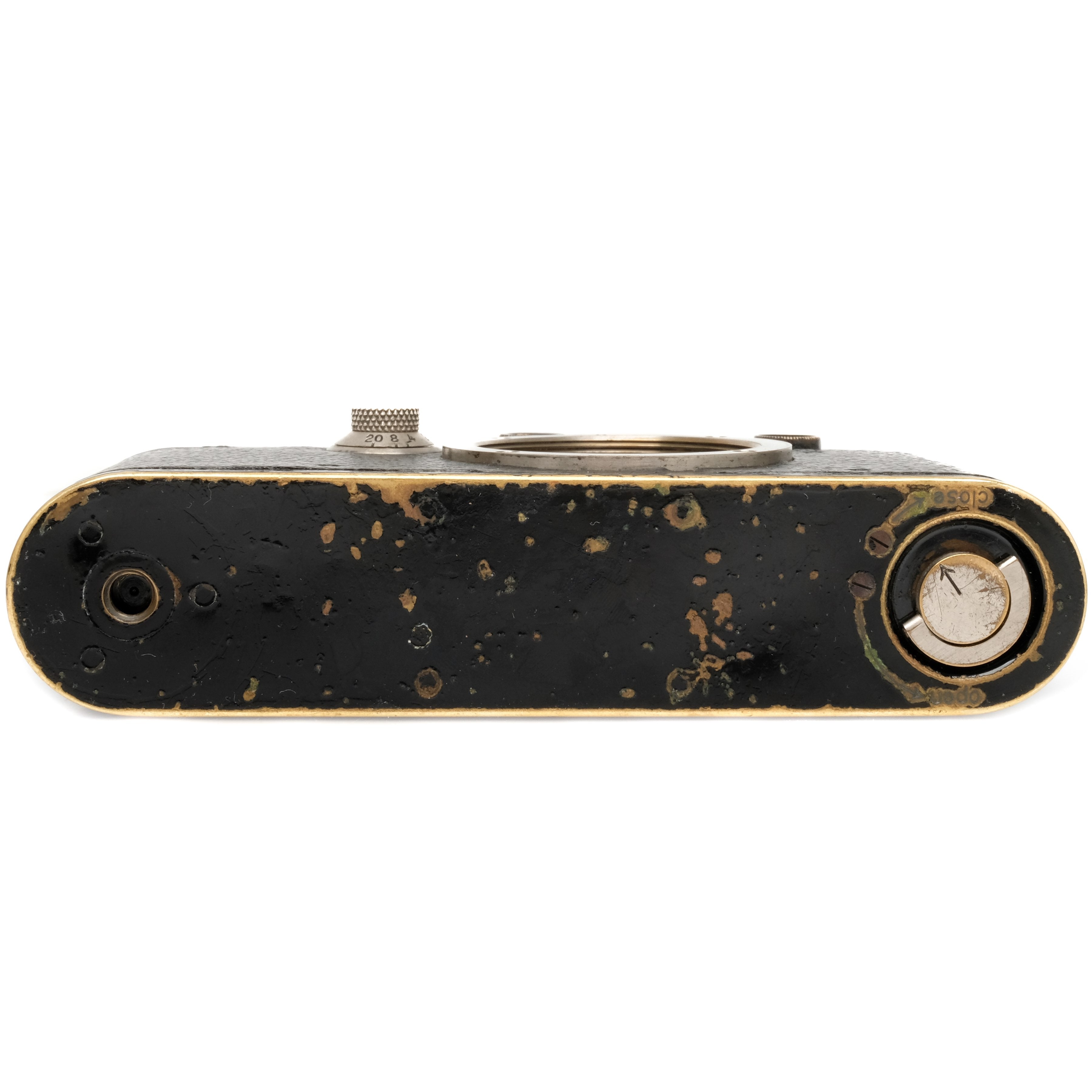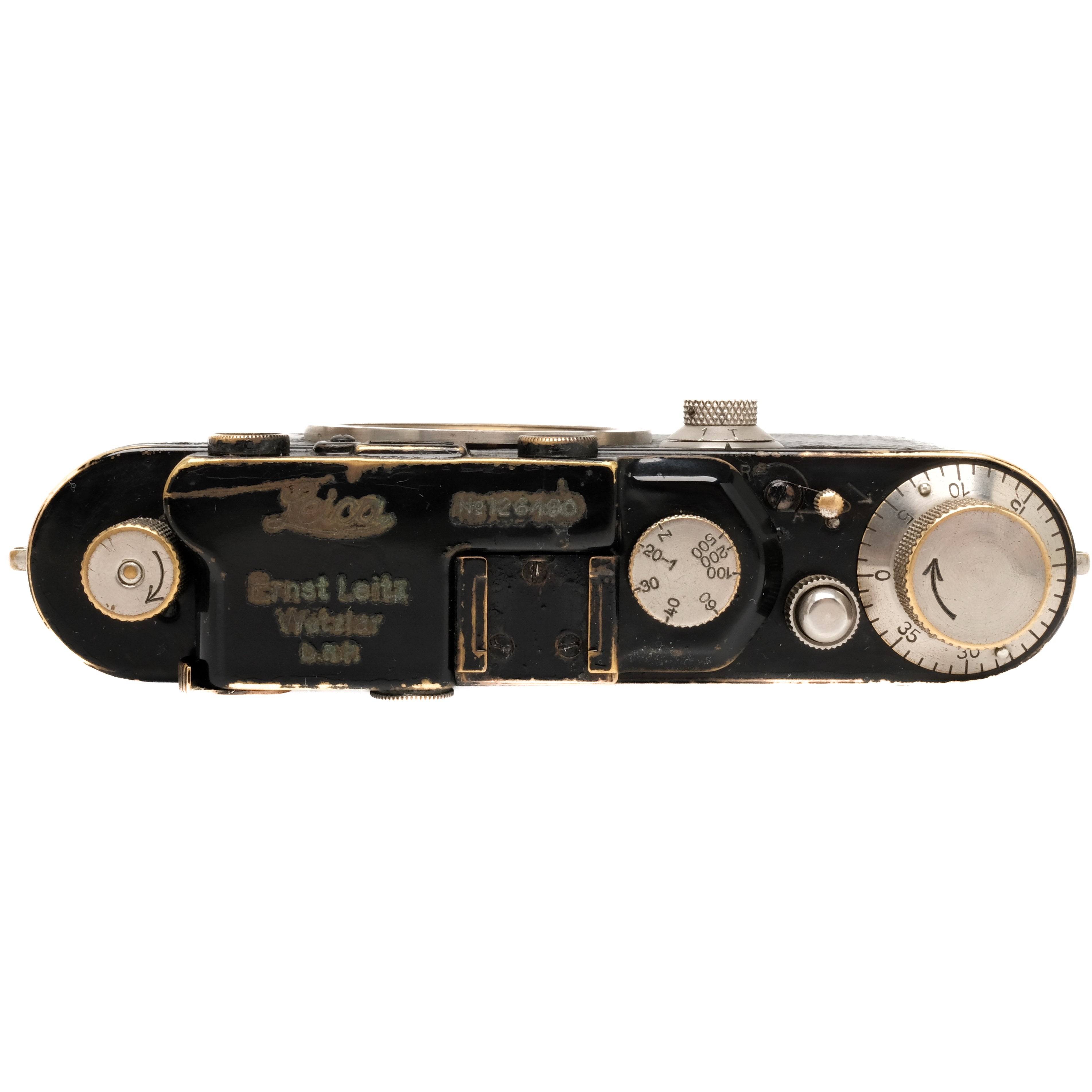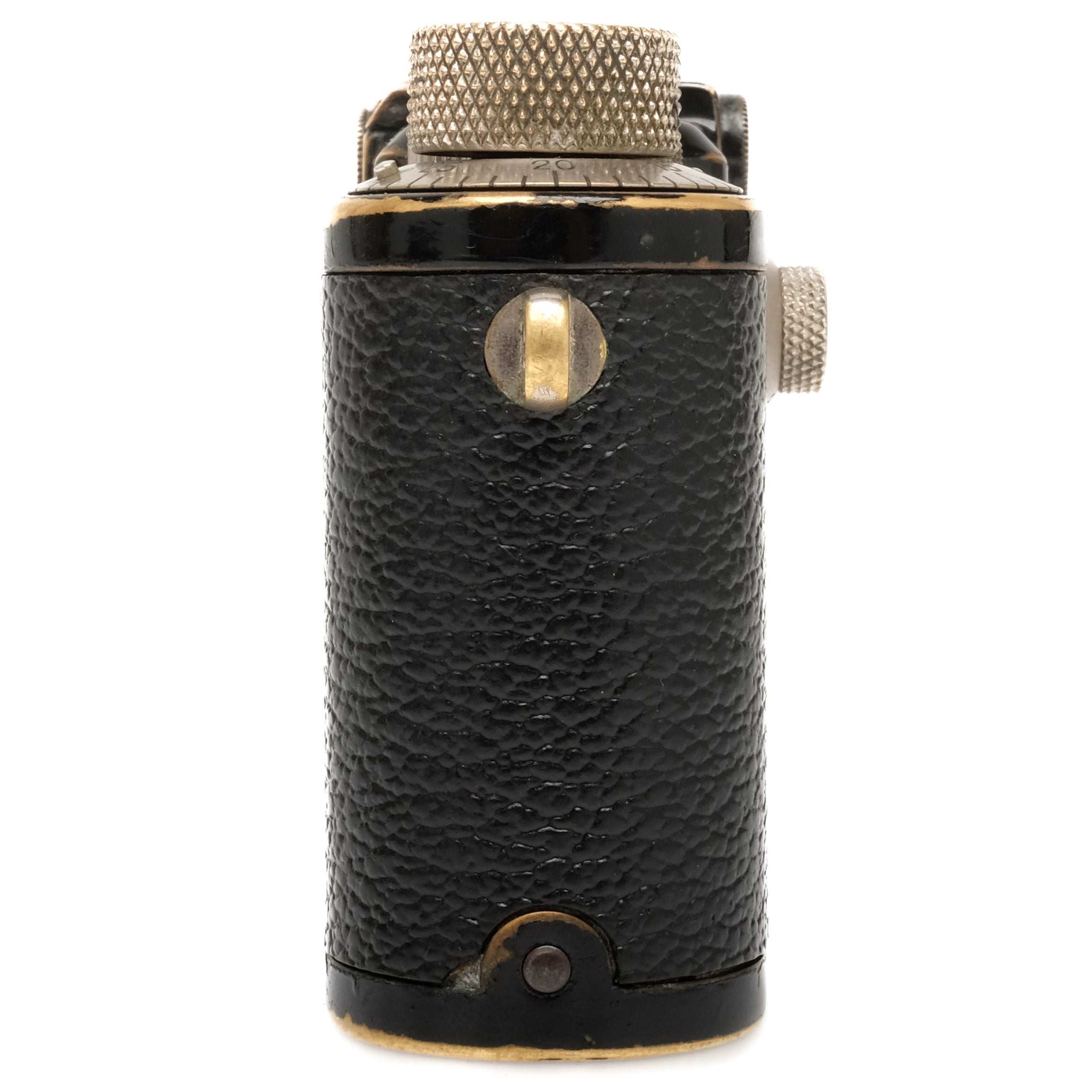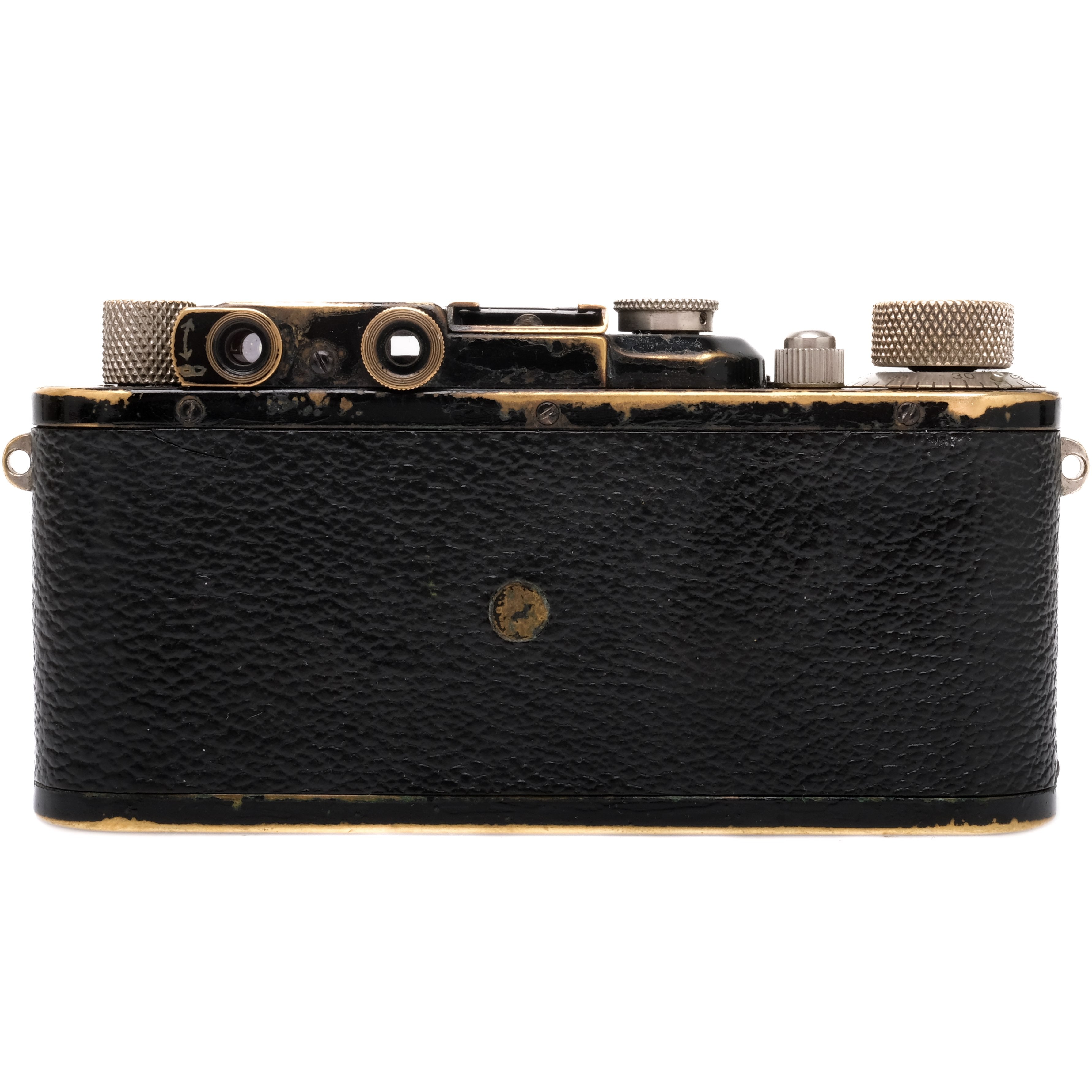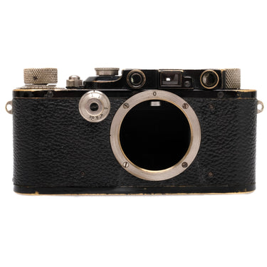 This Leica III Black is in heavily-used cosmetic condition with noticeable handling/edge wear found throughout, please see photos for visual reference. Cosmetically, this camera has been rated at a (7+) condition. This camera is in proper working order; the finder is clean, the film advance and shutter are smooth, and all shutter speeds are accurate. This camera includes a body cap.