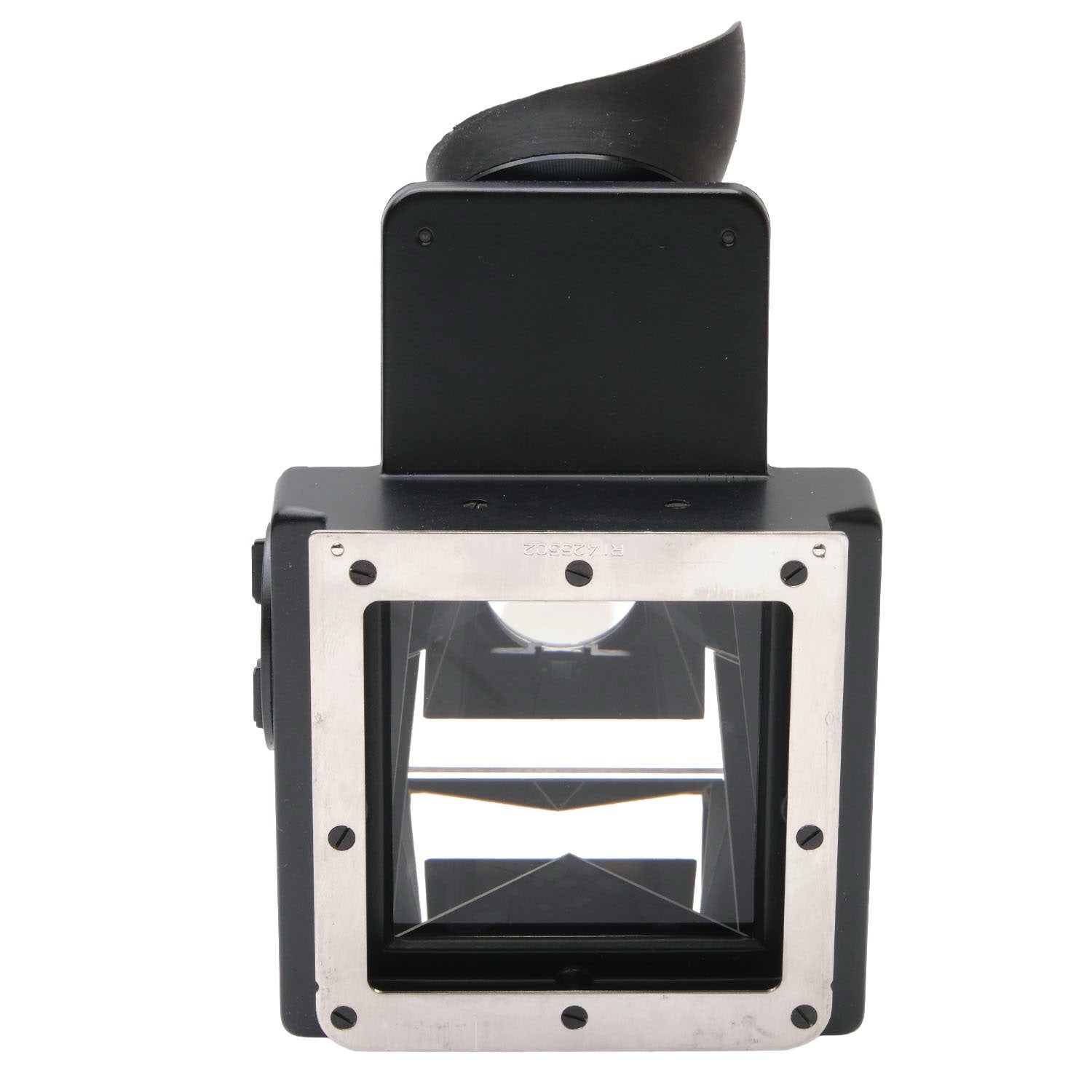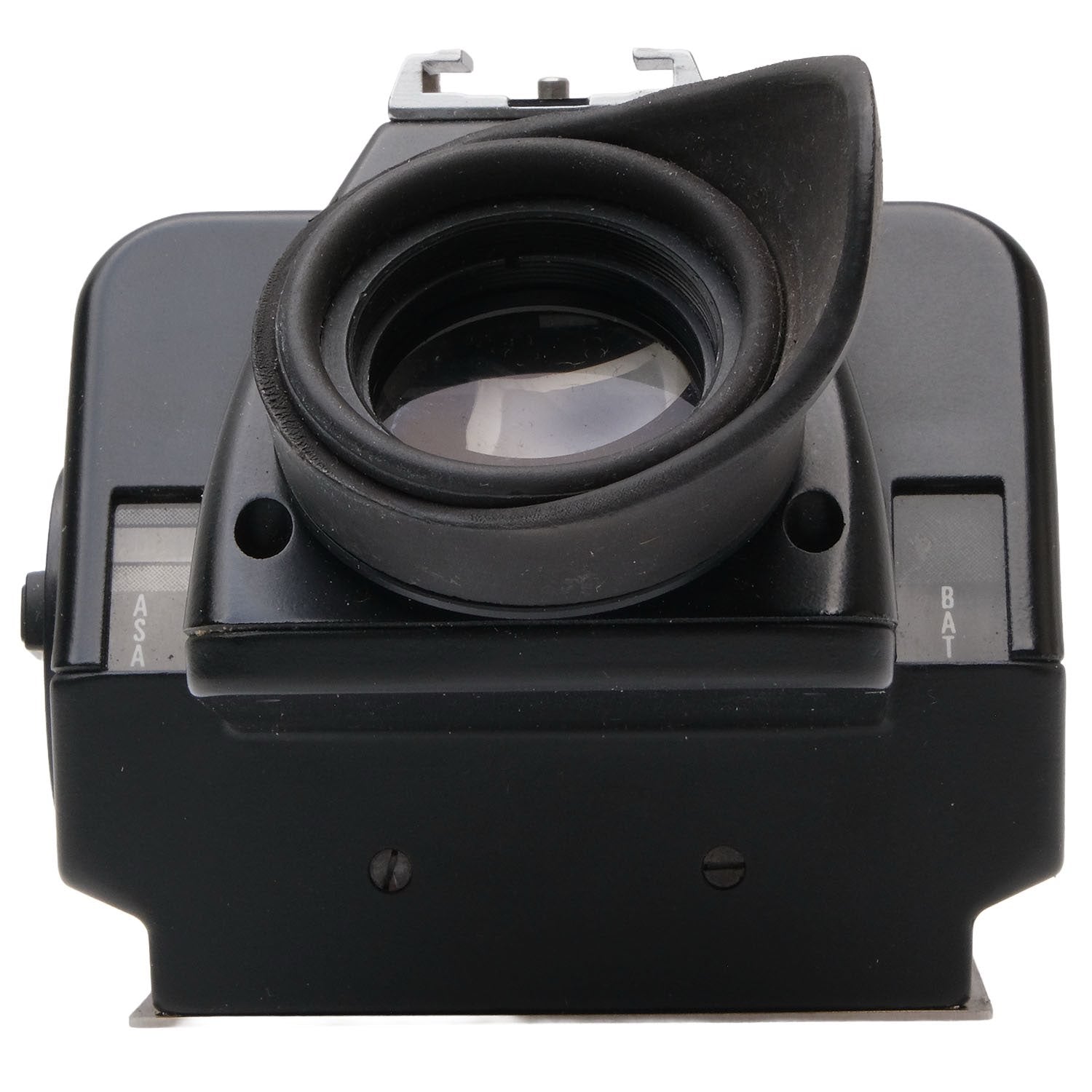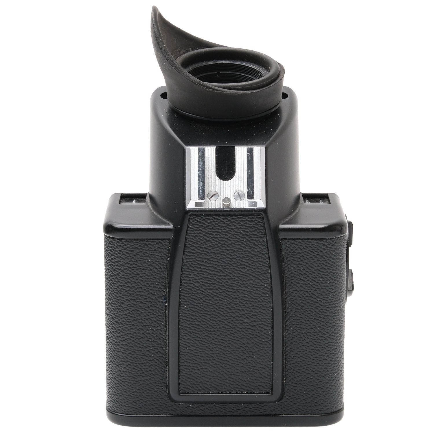 This Hasselblad PME Prism Viewfinder, #RI425502, is in great condition with minor handling wear. I rate it cosmetically a (9). The finder is in proper working order; the glass is clear, the electronics function, and the battery compartment is corrosion-free. It includes a protective cover. It uses one (1) 4LR44 battery (not included). Please refer to the photos for details.