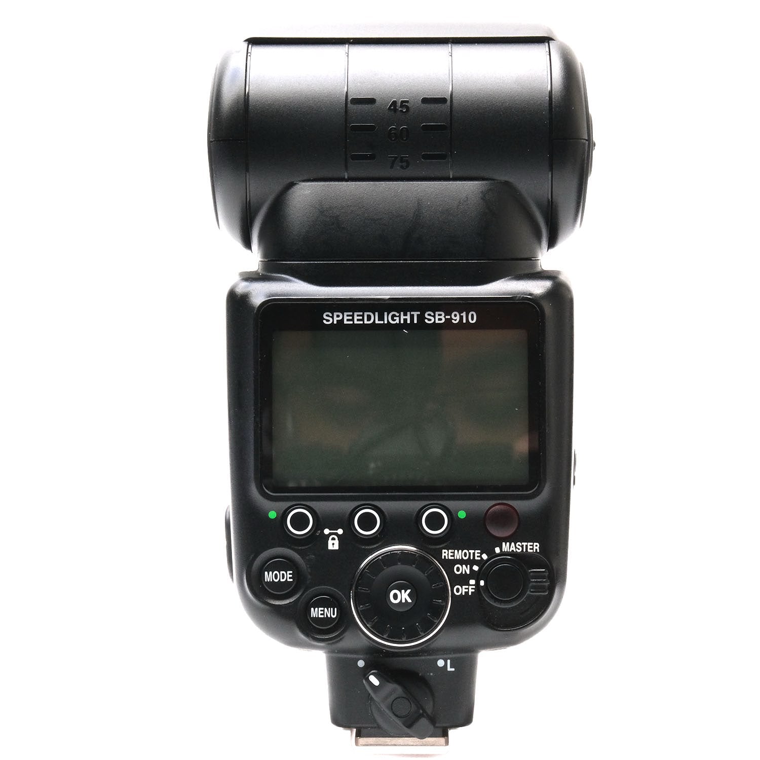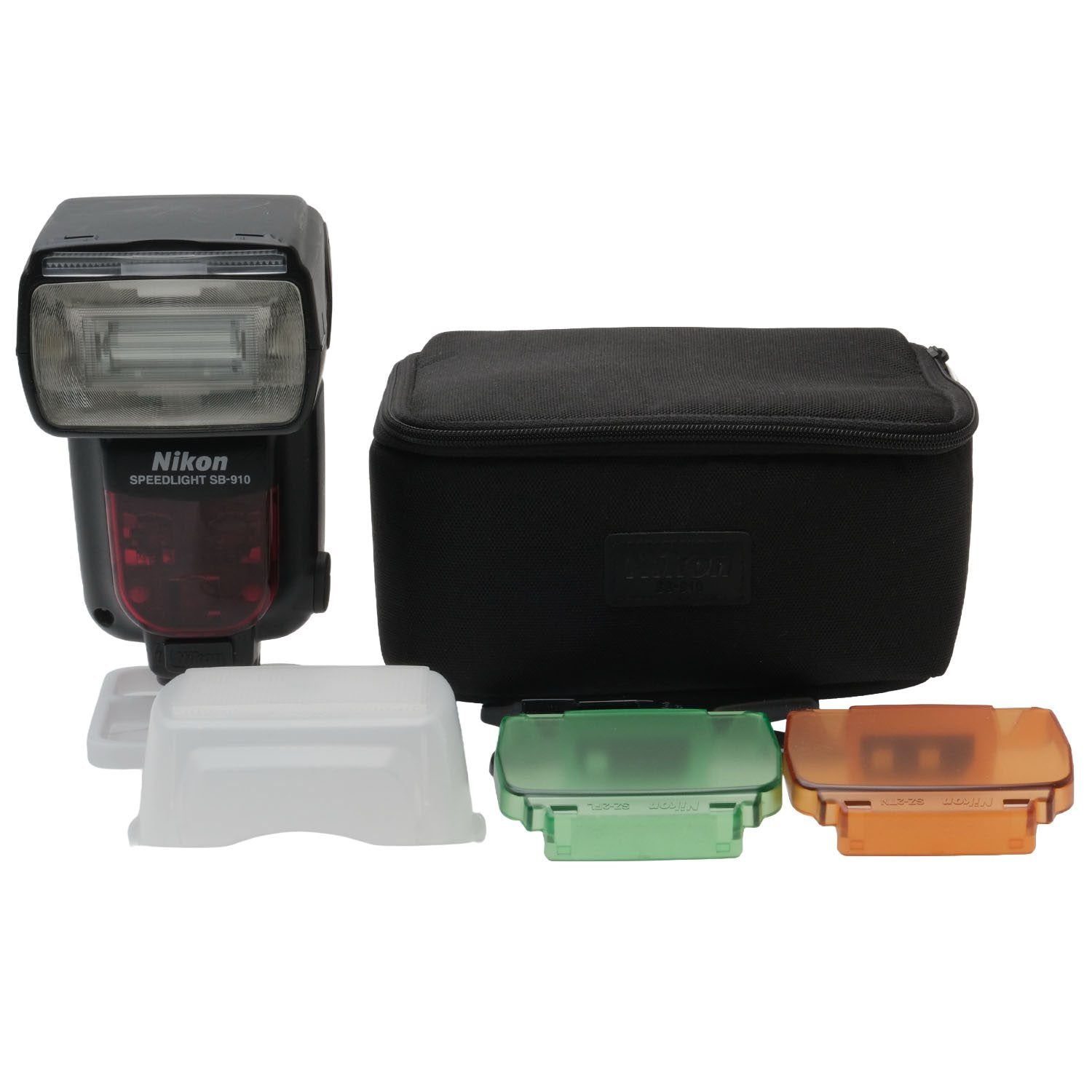 This Nikon Speedlight SB-910 Flash, #2071700, is in good condition with some handling wear. I rate it cosmetically an (8+). The flash is in proper working order and ready to be used; it fires and the battery compartment is corrosion-free. This flash includes a case, tabletop stand, orange & green filters, and slip-on diffuser. It uses four (4) AA batteries (not included). Please refer to the photos for details.