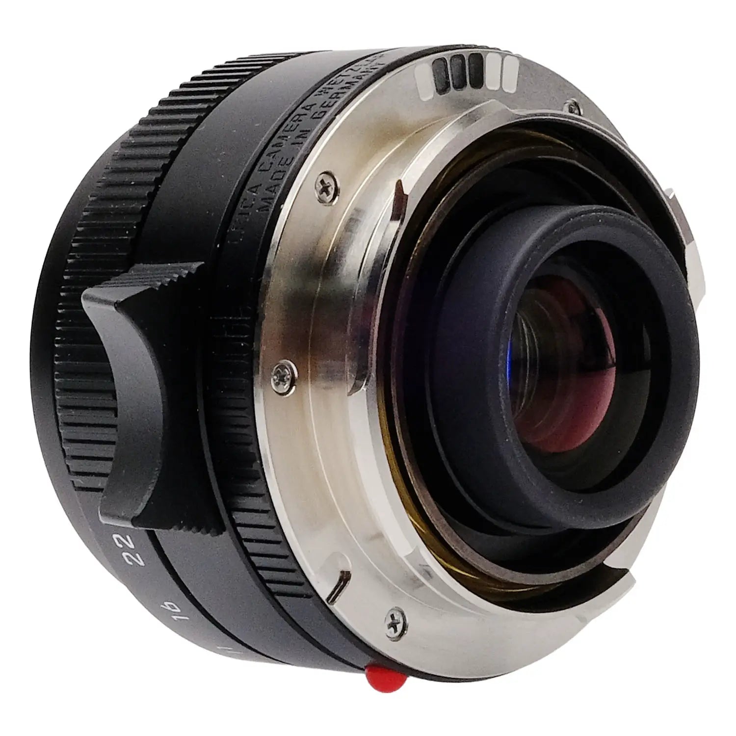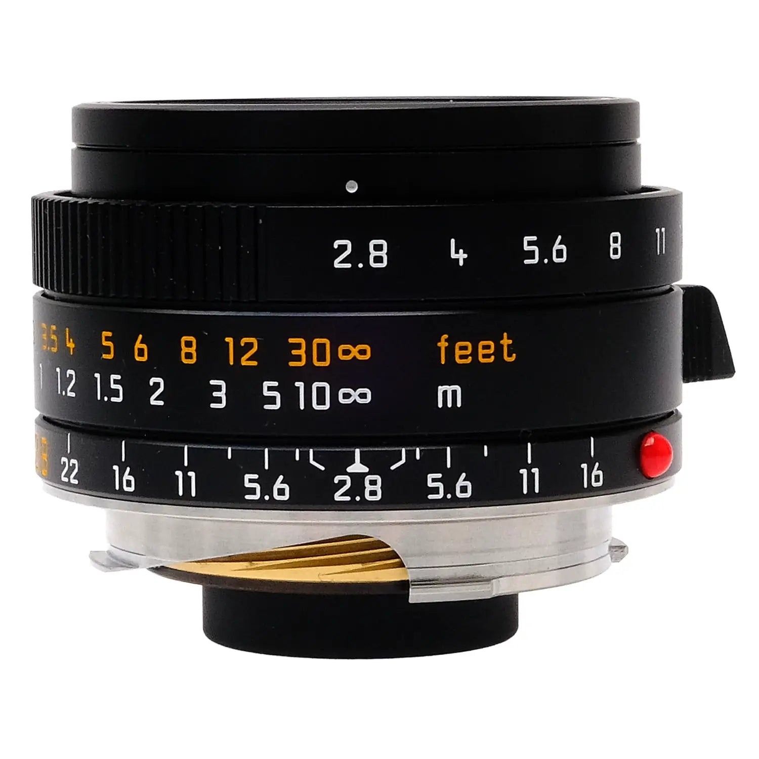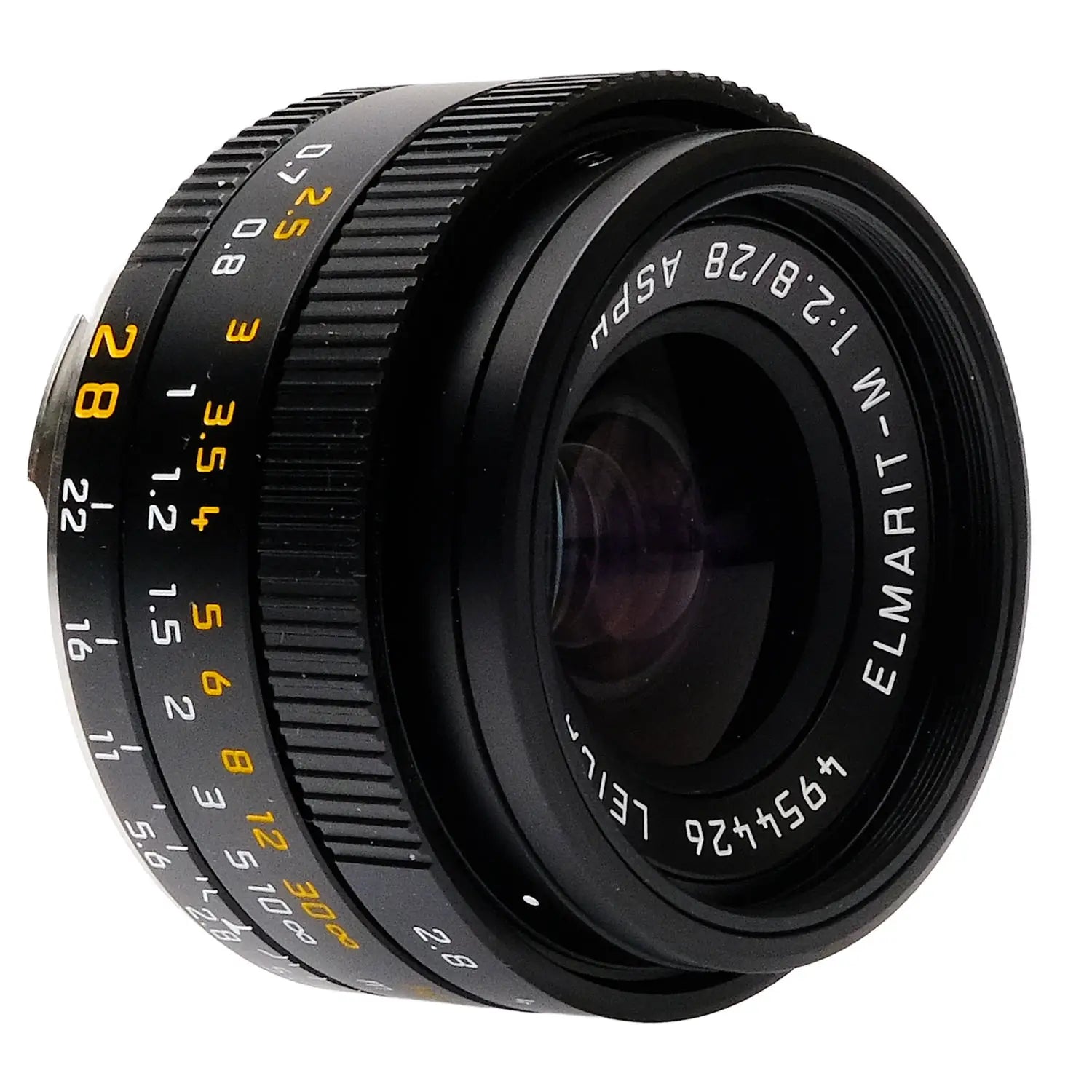 This Leica 28mm f2.8 Elmarit-M Asph II Lens (Black), #4954426, is in great condition with minor handling wear. I rate it cosmetically a (9+). The focus and aperture rings are smooth, the aperture functions properly, and the glass is clean and clear with no haze, marks, or fungus. There are a few faint specks of dust inside, but they do not affect image quality. This lens includes a leather Leica lens case, a threaded Leica lens hood with a front cover, a rear lens cap, a threaded front ring (which must be removed to mount the lens hood), metal front lens cap, and the original box. Please refer to the photos for details.
