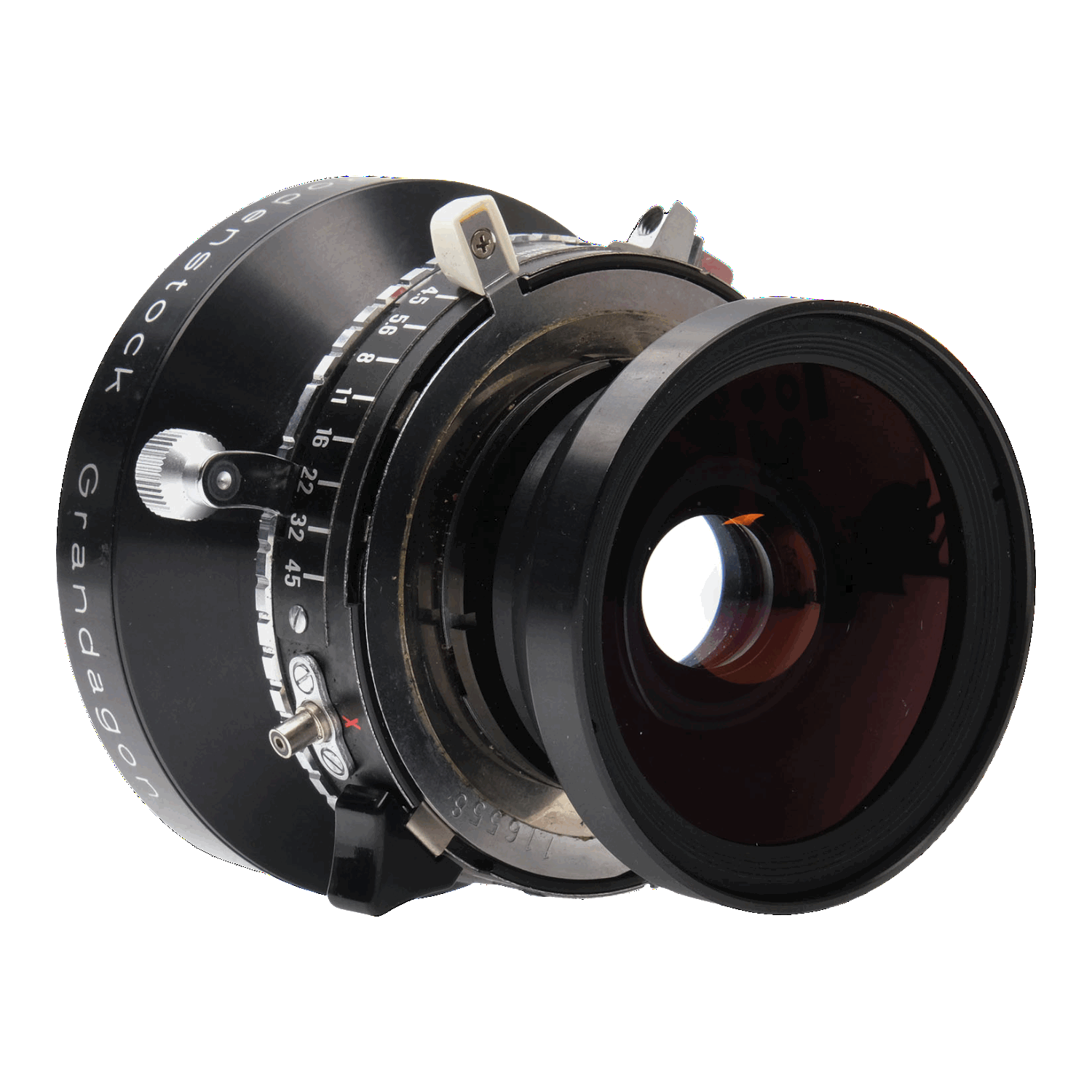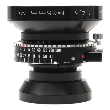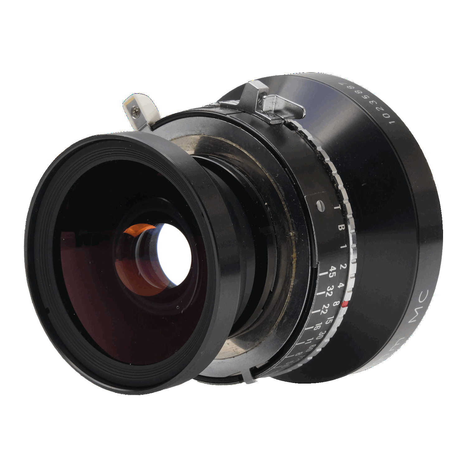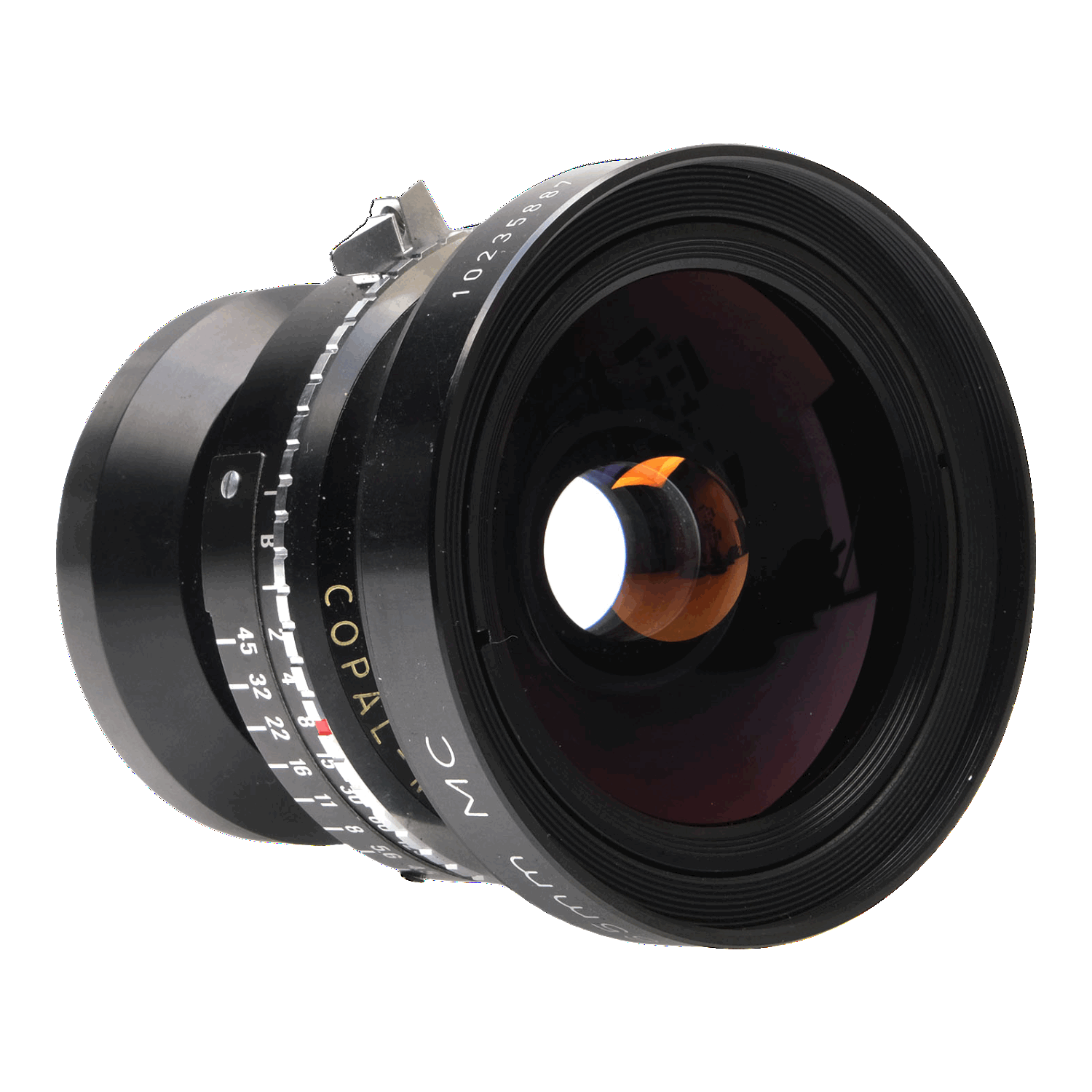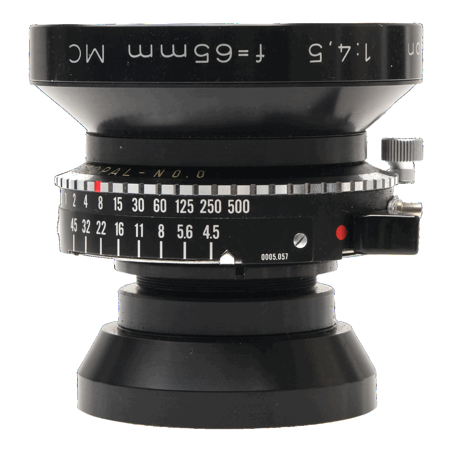 This Rodenstock 65mm f4.5 Grandagon MC Lens, #10235887, is in great condition with minor handling wear. I rate it cosmetically a (9). The glass is clean and clear with no haze, marks, or fungus. There are a few faint specks of dust inside, but they do not affect image quality. This lens has coverage up to 4x5", a 105 degree angle of view, and a 170mm image circle at f22. The included Copal No. 0 shutter, 116558, is in similar condition, also rated a (9). The shutter and aperture rings are smooth, the shutter is accurate at all speeds, and the aperture functions properly. This lens includes a retaining ring and front & rear caps. Please refer to the photos for details.