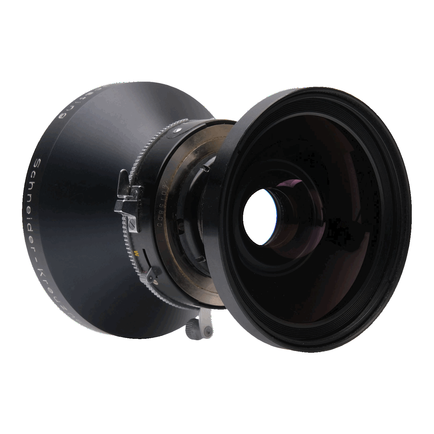 This Schneider-Kreuznach 90mm f5.6 Super-Angulon MC Lens, #13257750, is in great condition with minor handling wear. I rate it cosmetically a (9). The glass is clean and clear with no haze, marks, or fungus. There are a few faint specks of dust inside, but they do not affect image quality. It has coverage up to 5x7", a 105-degree angle of view, and a 235mm image circle at f22. The included Copal No. 0 shutter, #76015800, is in similar condition, also rated a (9). The aperture lever and shutter speed wheel are smooth, the shutter is accurate at all speeds, and the aperture functions properly. This lens includes front & rear caps and a retaining ring. Please refer to the photos for details.