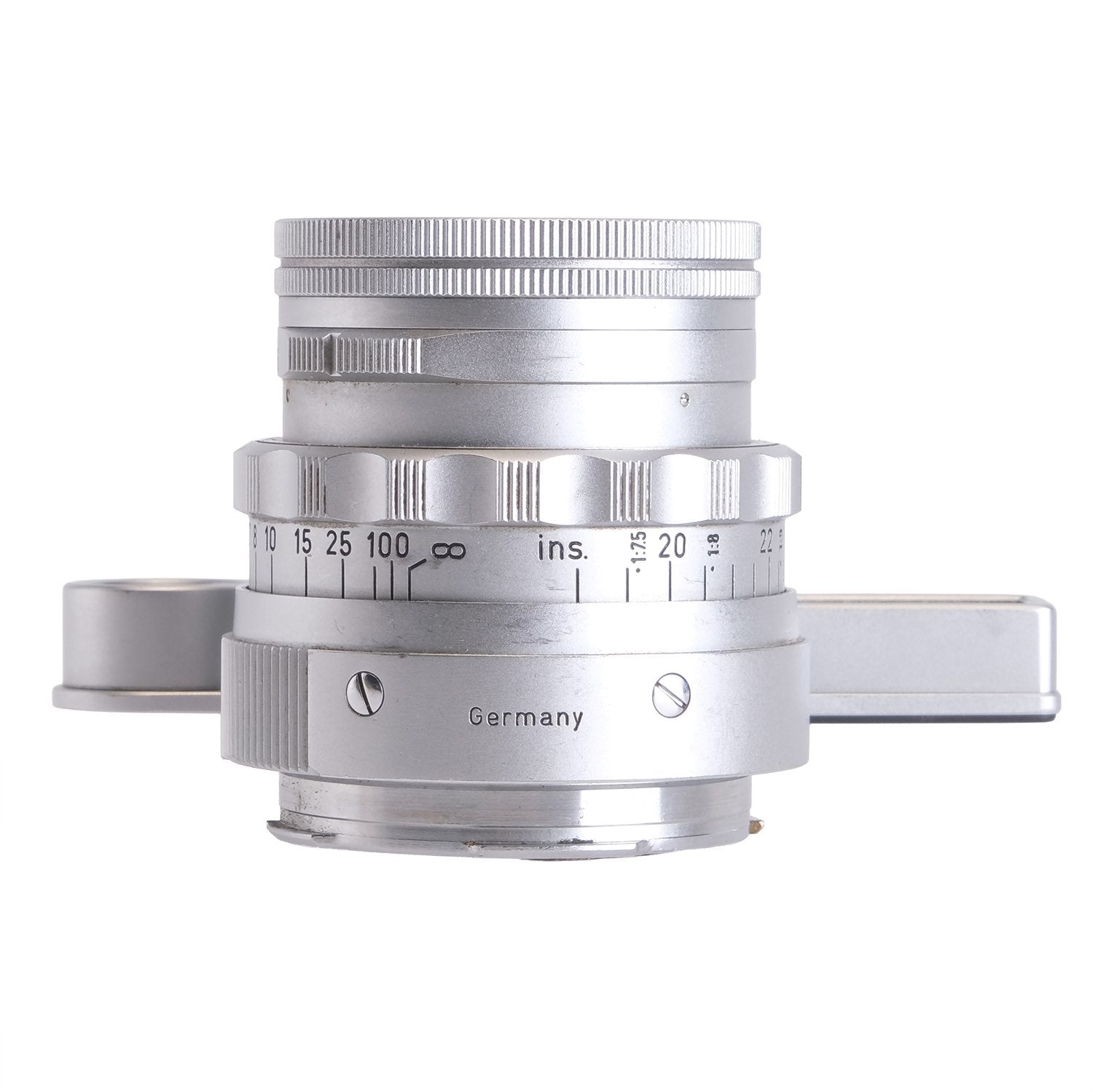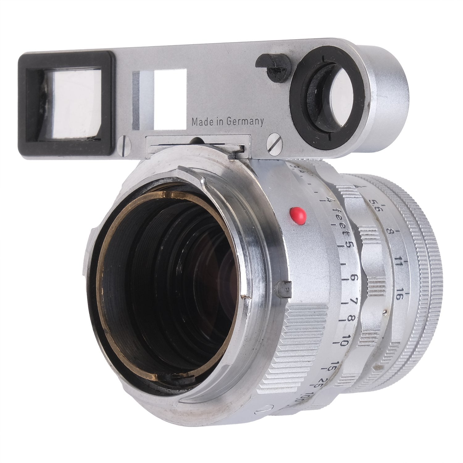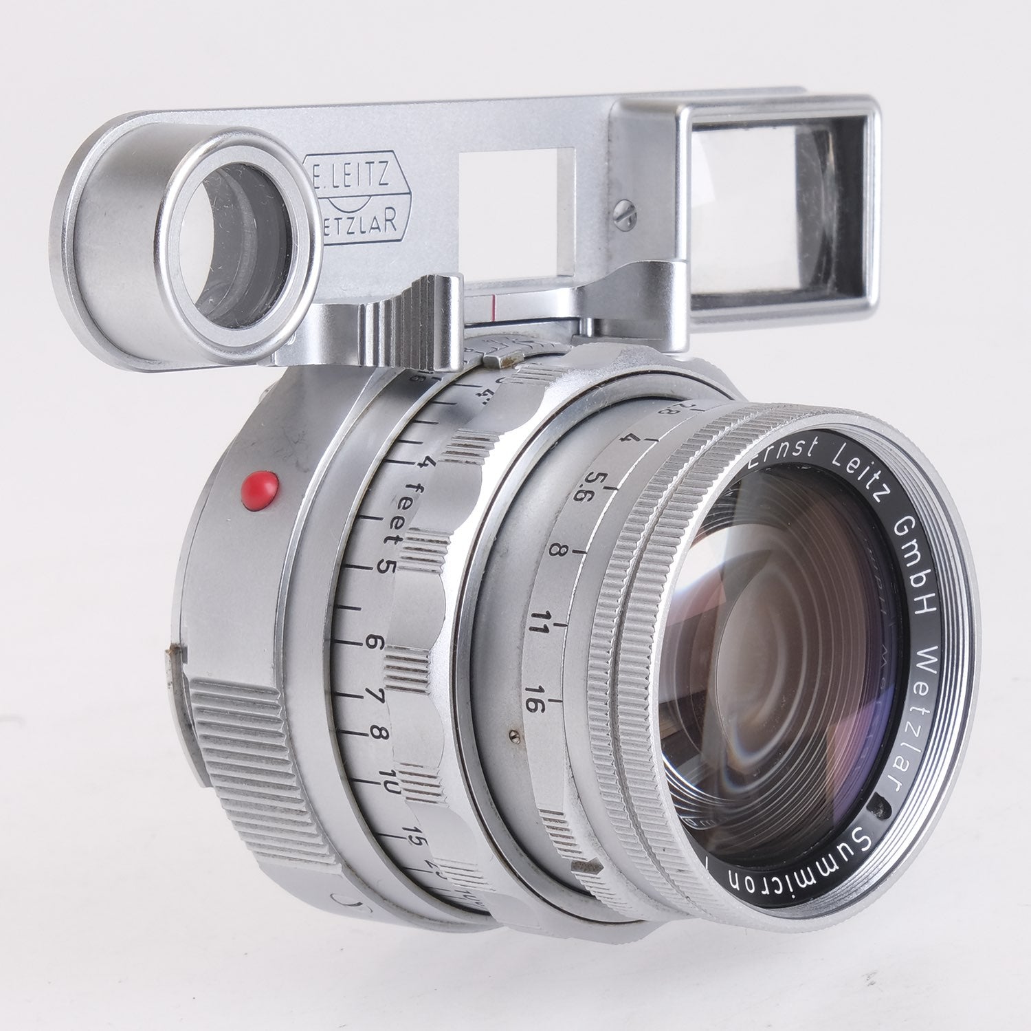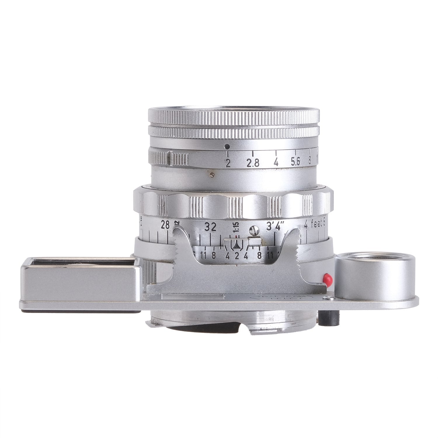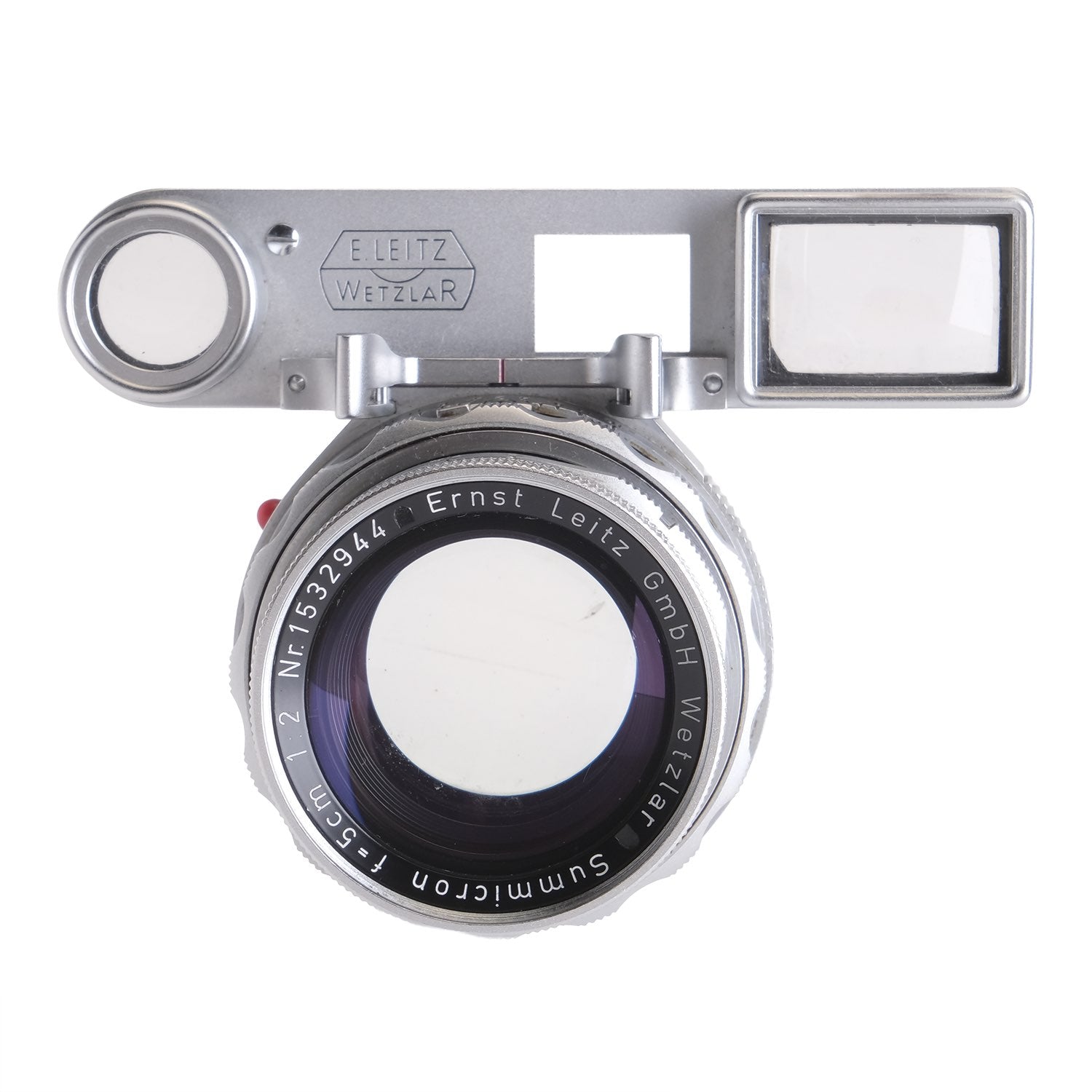 This Leica 5cm f2 Summicron DR w/ SPDOO #1532944, is in average cosmetic condition with heavy signs of handling wear found throughout, please see photos for visual reference. Cosmetically, this lens has been rated at a (8) condition. This lens is in proper working order; the aperture and focus turn smoothly, and the glass has faint cleaning marks and faint haze which should not affect quality. There are no signs of fungus present. This lens comes with SPDOO attachment and a rear cap only. This lens is ready for use!