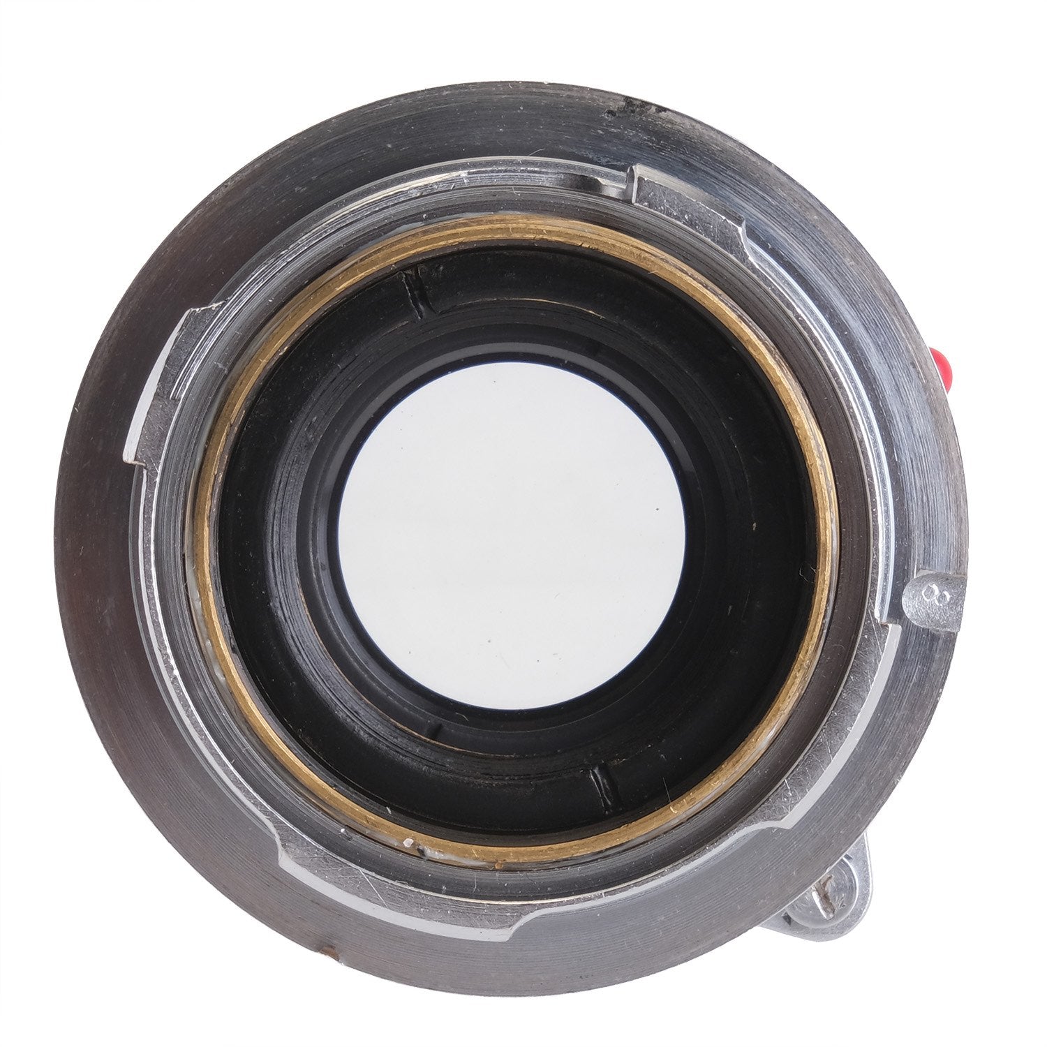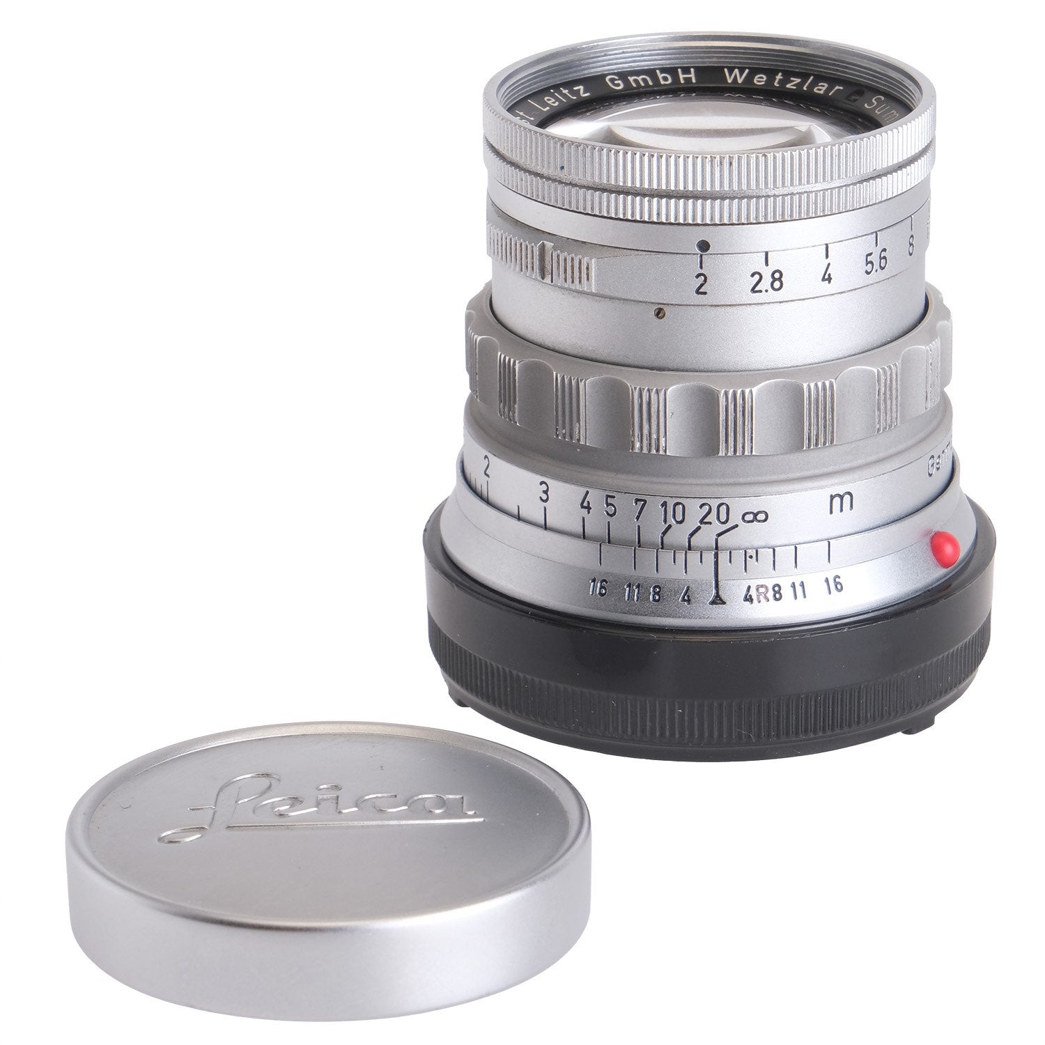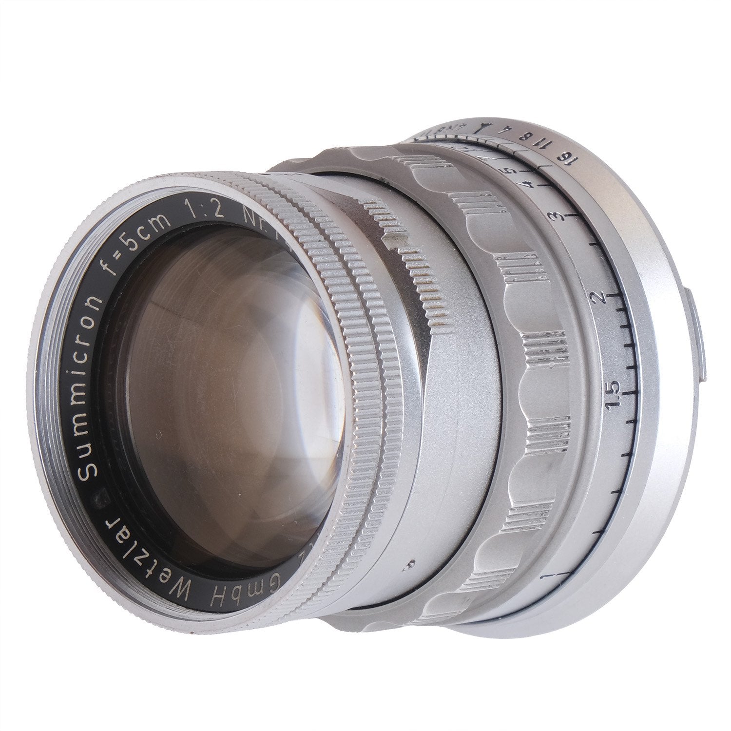 This Leica 5cm f2 Summicron Rigid Lens #1465160, is in average cosmetic condition with heavy signs of handling wear found throughout, please see photos for visual reference. Cosmetically, this lens has been rated at a (8+) condition. This lens is in proper working order; the aperture and focus turn smoothly, and the glass has minor coating marks, faint haze, and schneideritis which should not affect image quality. This lens comes with a front and rear cap only. This lens comes as is.
