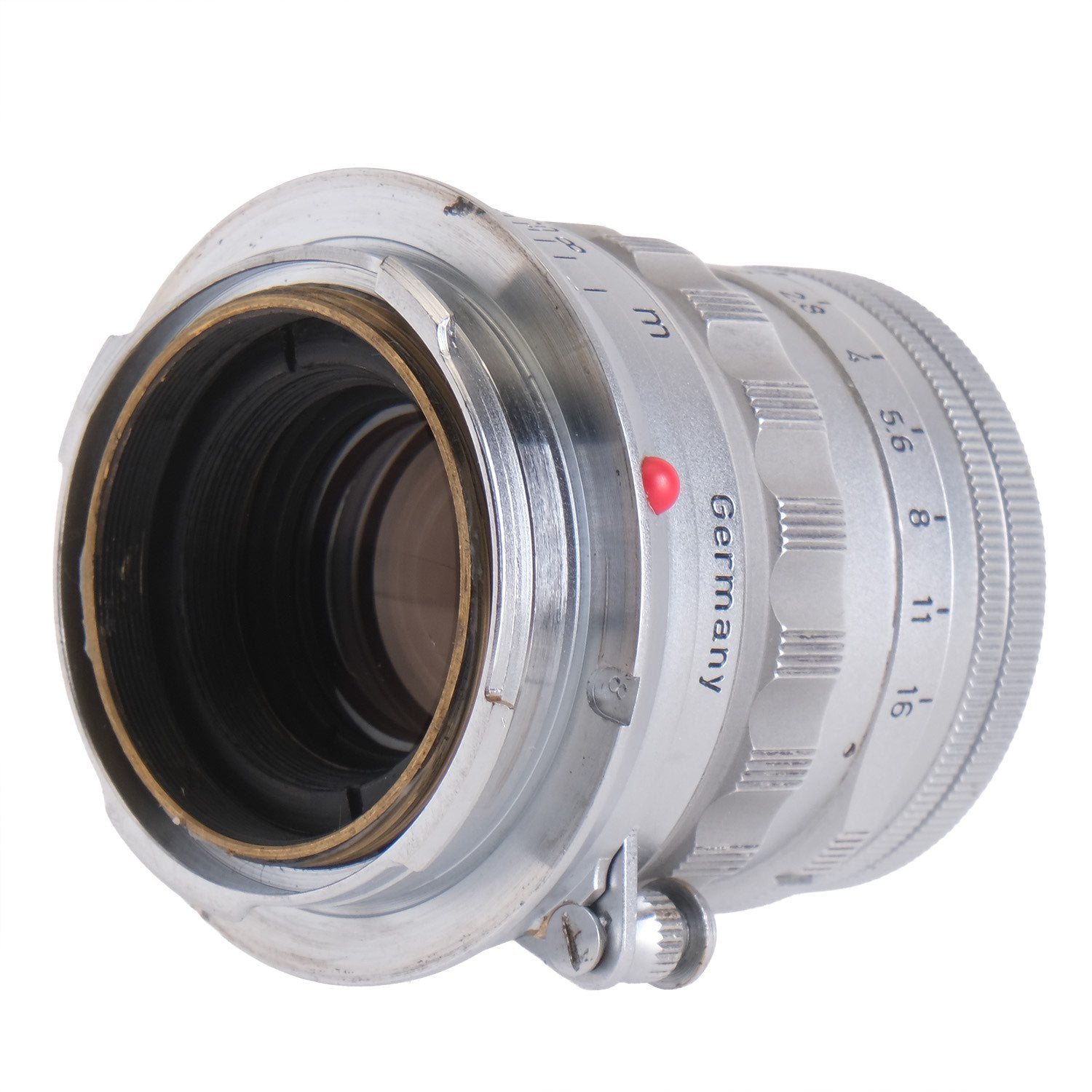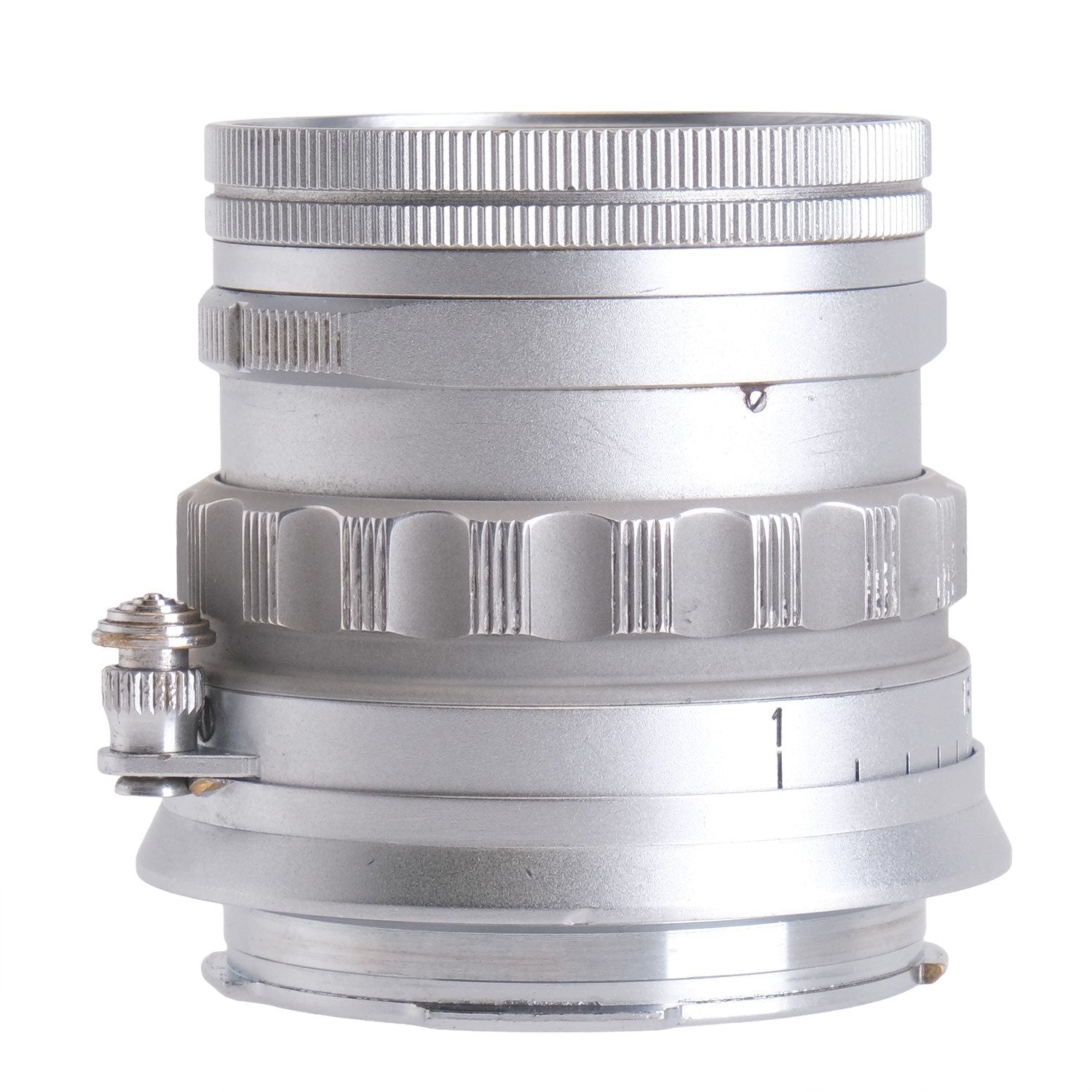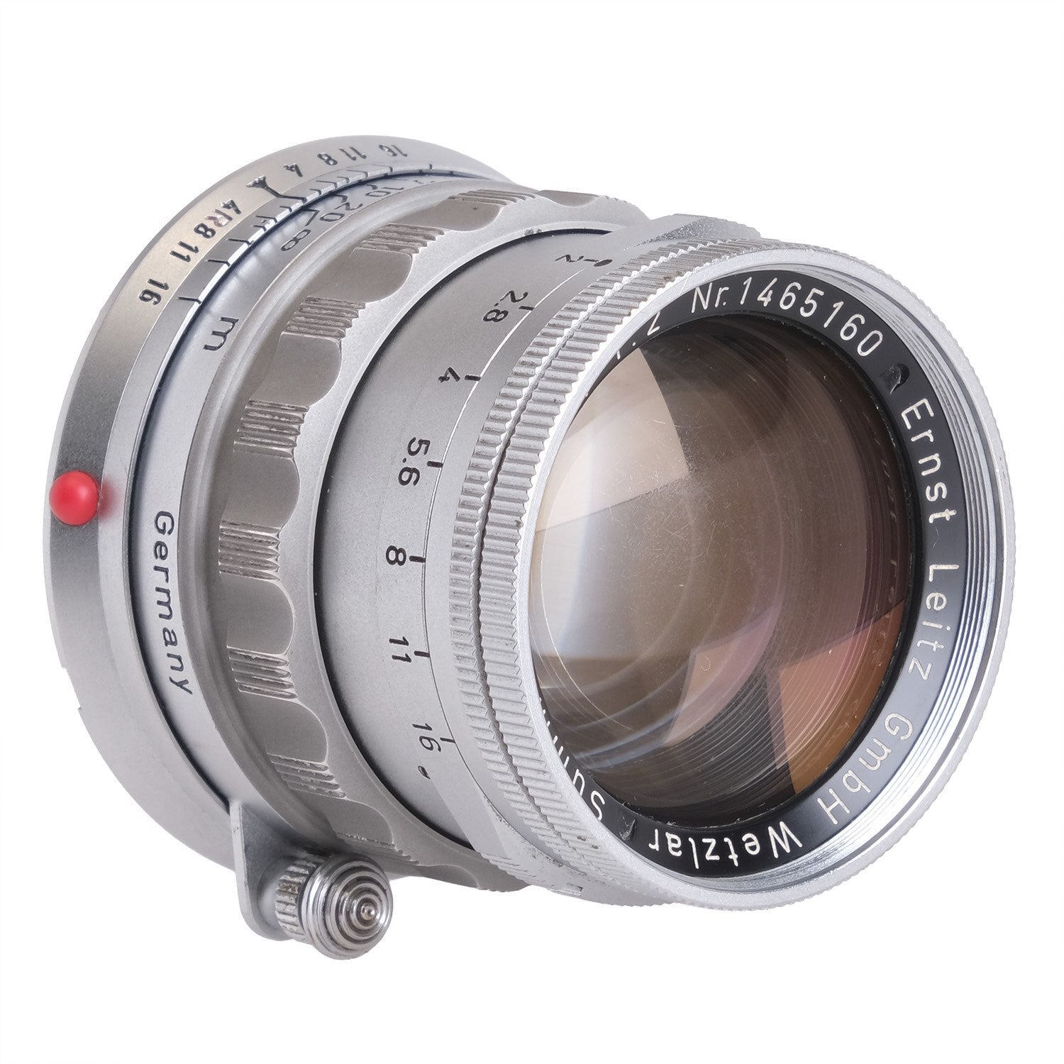 This Leica 5cm f2 Summicron Rigid Lens #1465160, is in average cosmetic condition with heavy signs of handling wear found throughout, please see photos for visual reference. Cosmetically, this lens has been rated at a (8+) condition. This lens is in proper working order; the aperture and focus turn smoothly, and the glass has minor coating marks, faint haze, and schneideritis which should not affect image quality. This lens comes with a front and rear cap only. This lens comes as is.