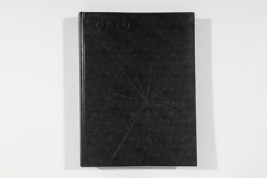 The monolithic publication is painstakingly hand-bound in leather bearing totemic coordinates to the planet Earth, blind stamped end sheets, black sprayed edges, and a loose steel plaque, that once removed, leaves the volume without language.