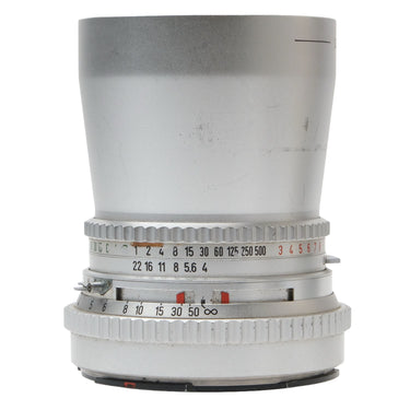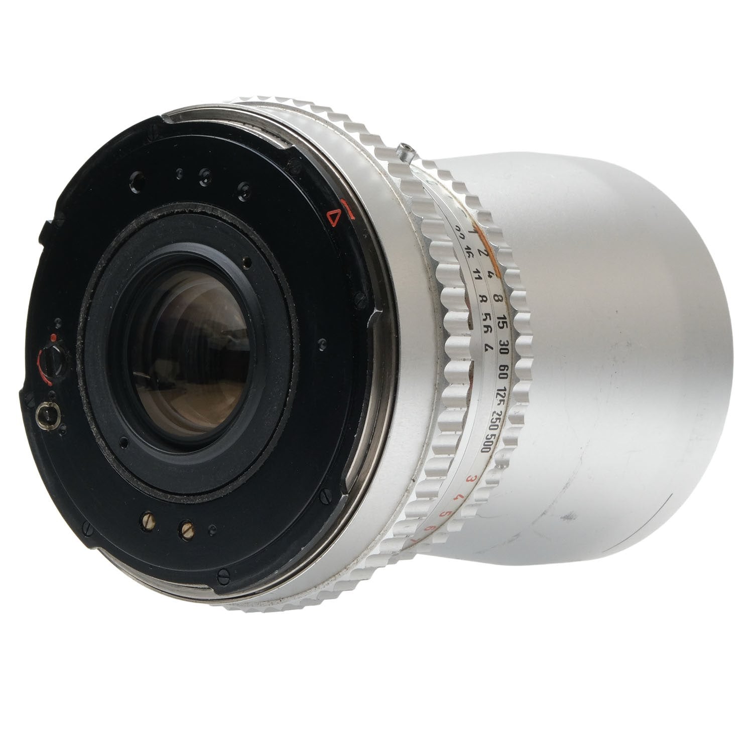 This Hasselblad C 50mm f4 Distagon Lens (Silver), #5143685, is in good condition with some handling wear. I rate it cosmetically an (8). The focus, aperture and shutter speed rings are a bit stiff, but the aperture functions properly and the shutter is accurate at all speeds. The glass has no markes or fungus, but there's some light etched haze and dust inside. This lens includes front & rear caps. Please refer to the photos for details.