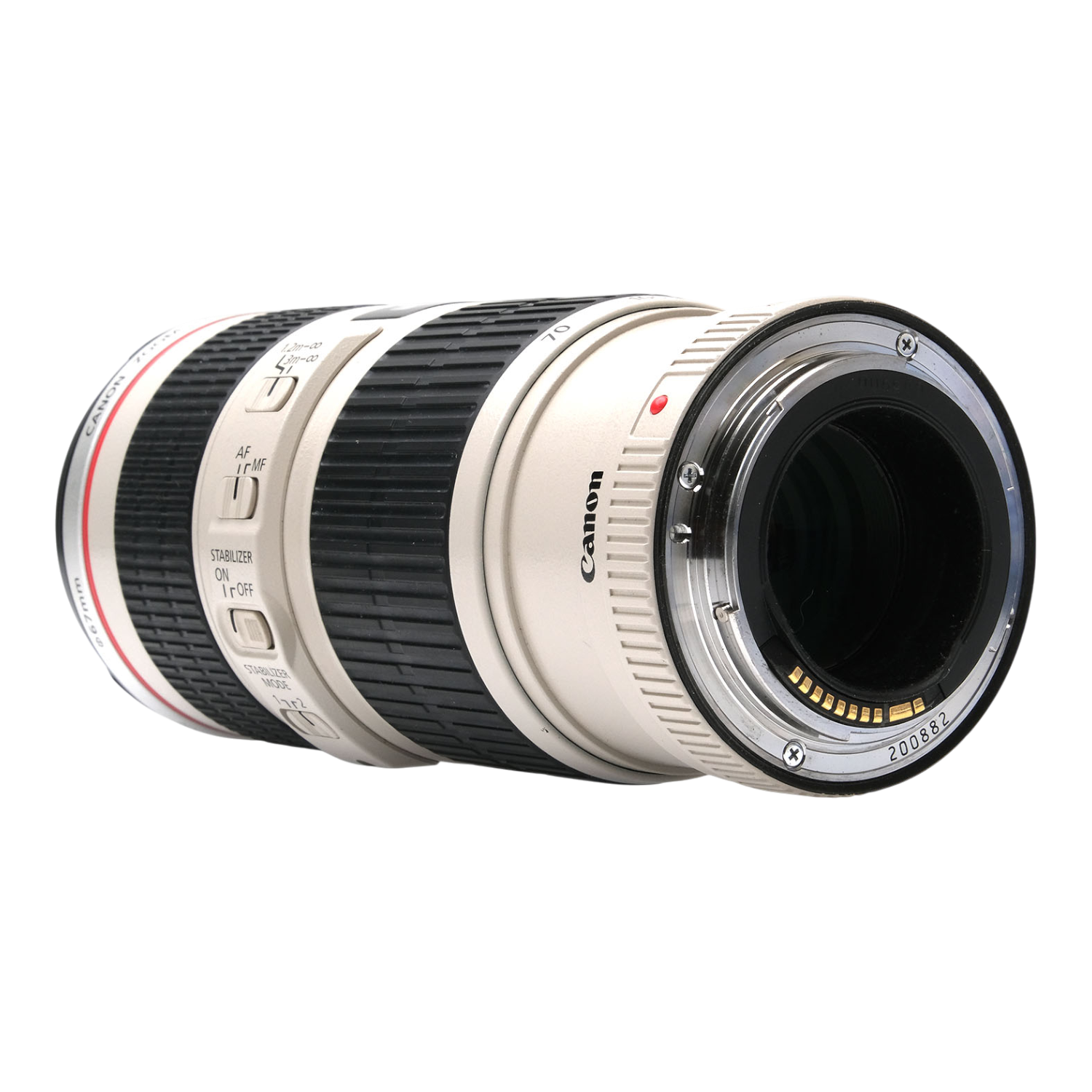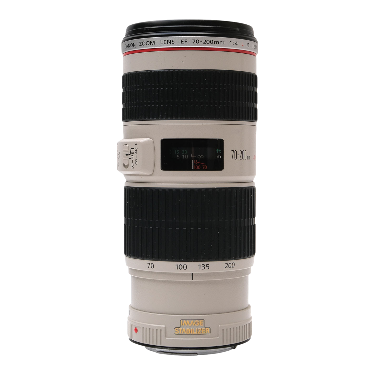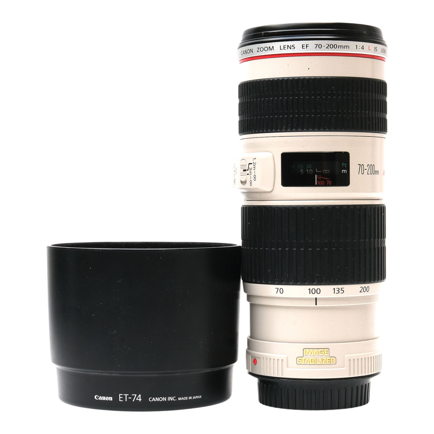 This Canon EF 70-200mm f4 L IS USM Zoom Lens, #200882, is in great condition with minor handling wear. I rate it cosmetically a (9). The focus and zoom rings are smooth, the autofocus and aperture function properly, and the glass is clean and clear with no haze, marks, or fungus. There are a few faint specks of dust inside, but they do not affect image quality. This lens includes a Canon lens hood and front & rear caps. Please refer to the photos for details.