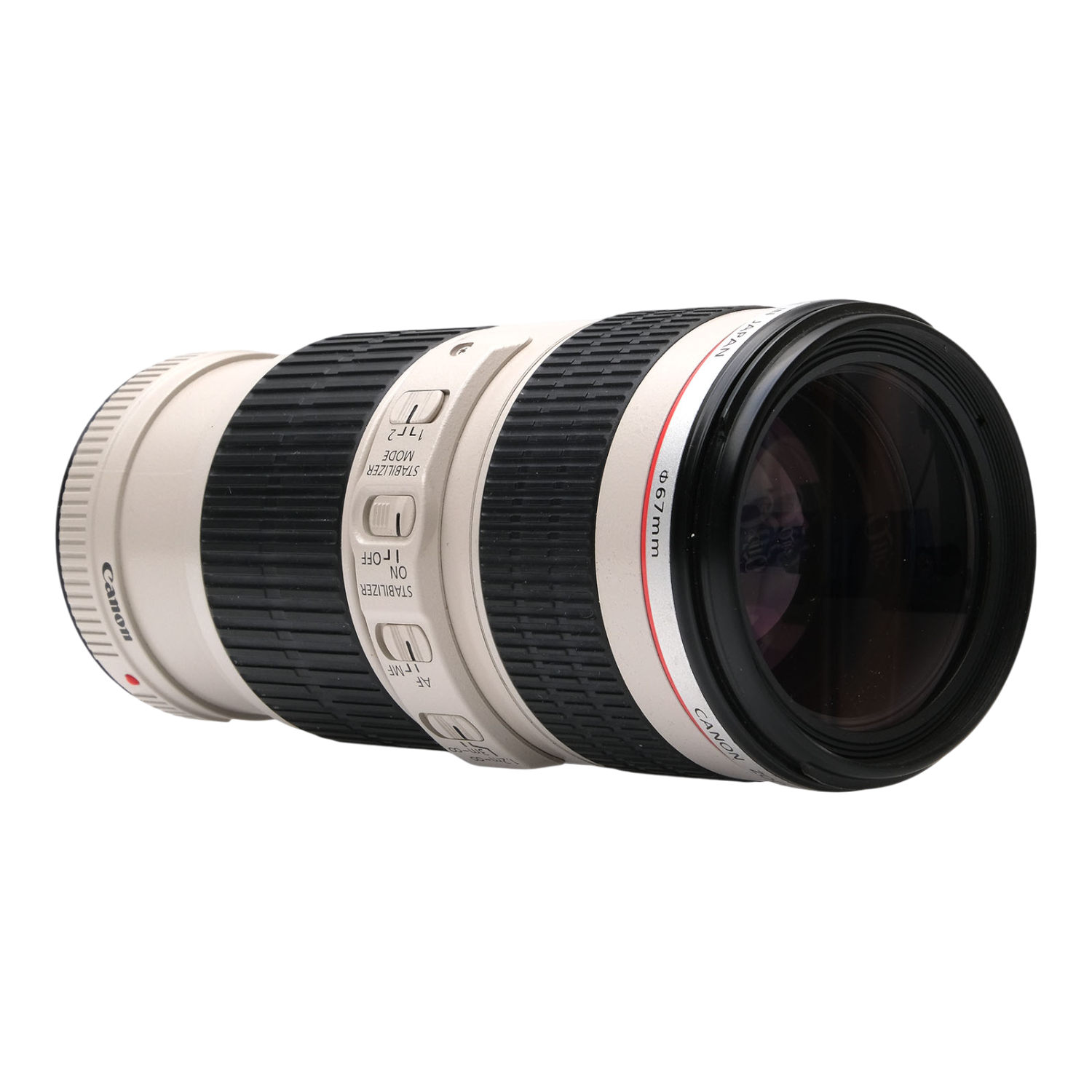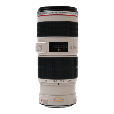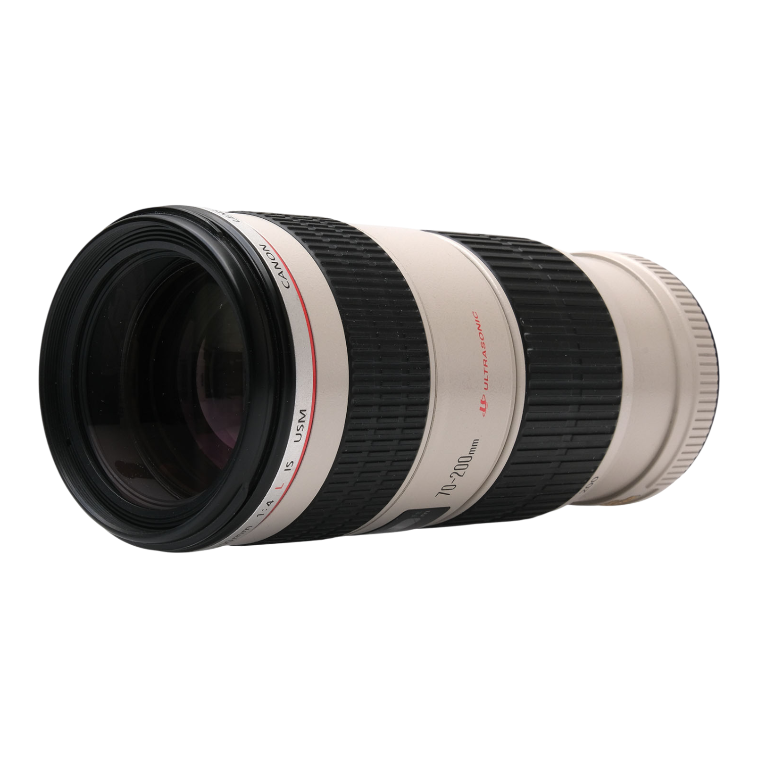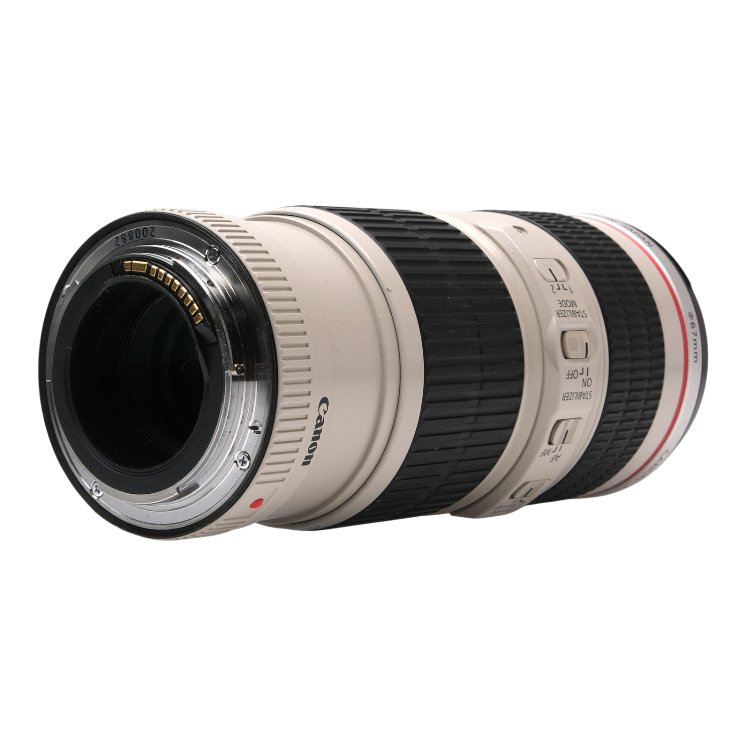 This Canon EF 70-200mm f4 L IS USM Zoom Lens, #200882, is in great condition with minor handling wear. I rate it cosmetically a (9). The focus and zoom rings are smooth, the autofocus and aperture function properly, and the glass is clean and clear with no haze, marks, or fungus. There are a few faint specks of dust inside, but they do not affect image quality. This lens includes a Canon lens hood and front & rear caps. Please refer to the photos for details.