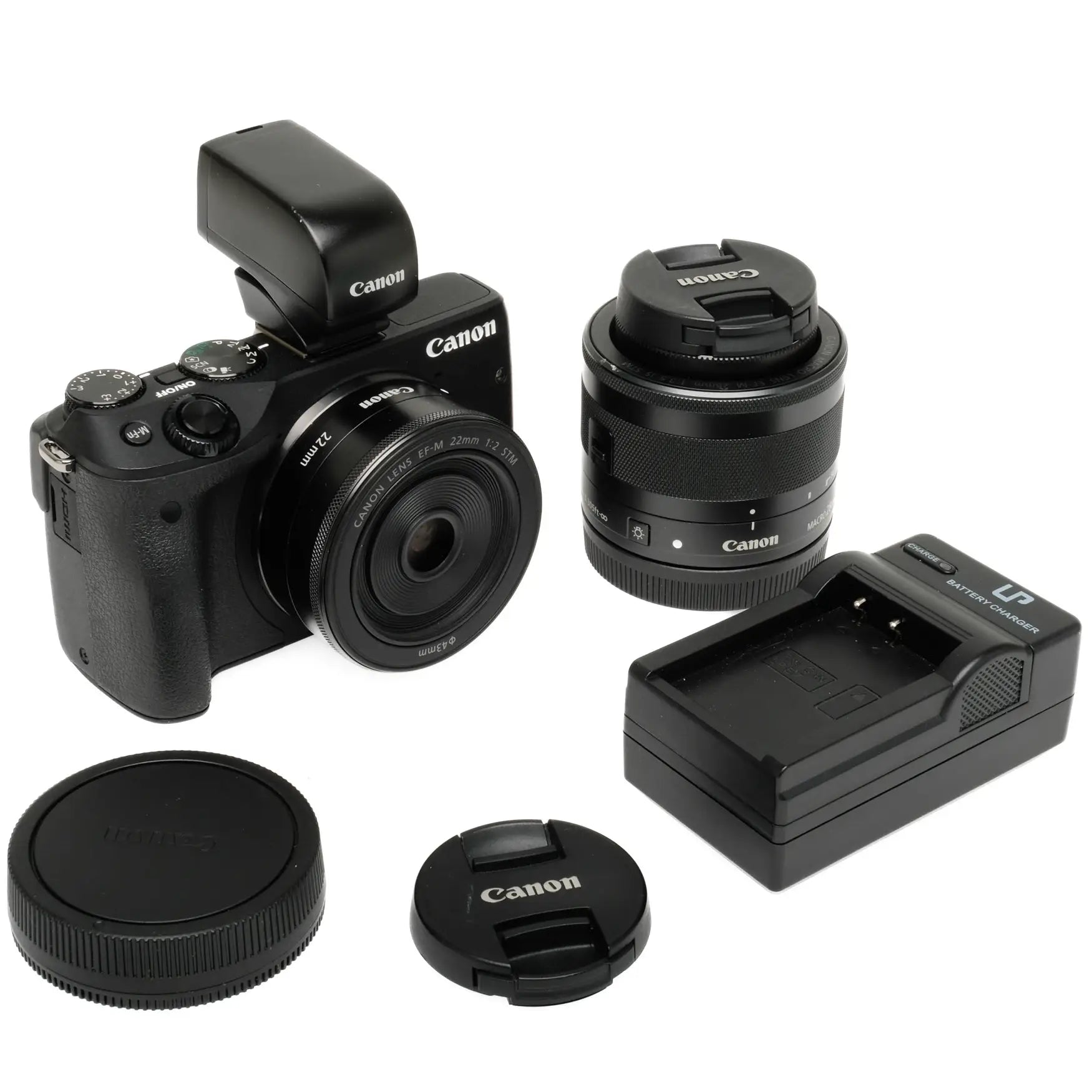 This Canon EOS M3 w/ 22mm f2, 28mm f3.5, EVF-DC1 Mirrorless Digital Camera Kit, #92043002701 is in good condition with some signs of wear. I rate this cosmetically 9. There is minimal cosmetic wear from normal use. This camera is in proper working order with a clean, unmarked sensor. The shutter is accurate and the battery/card slots are clean and good. The 22mm and 28mm lenses are clean and clear with no haze or fungus. Comes with Battery, Charger, caps, and EVF-DC1 viewfinder. Please see photos for reference.
