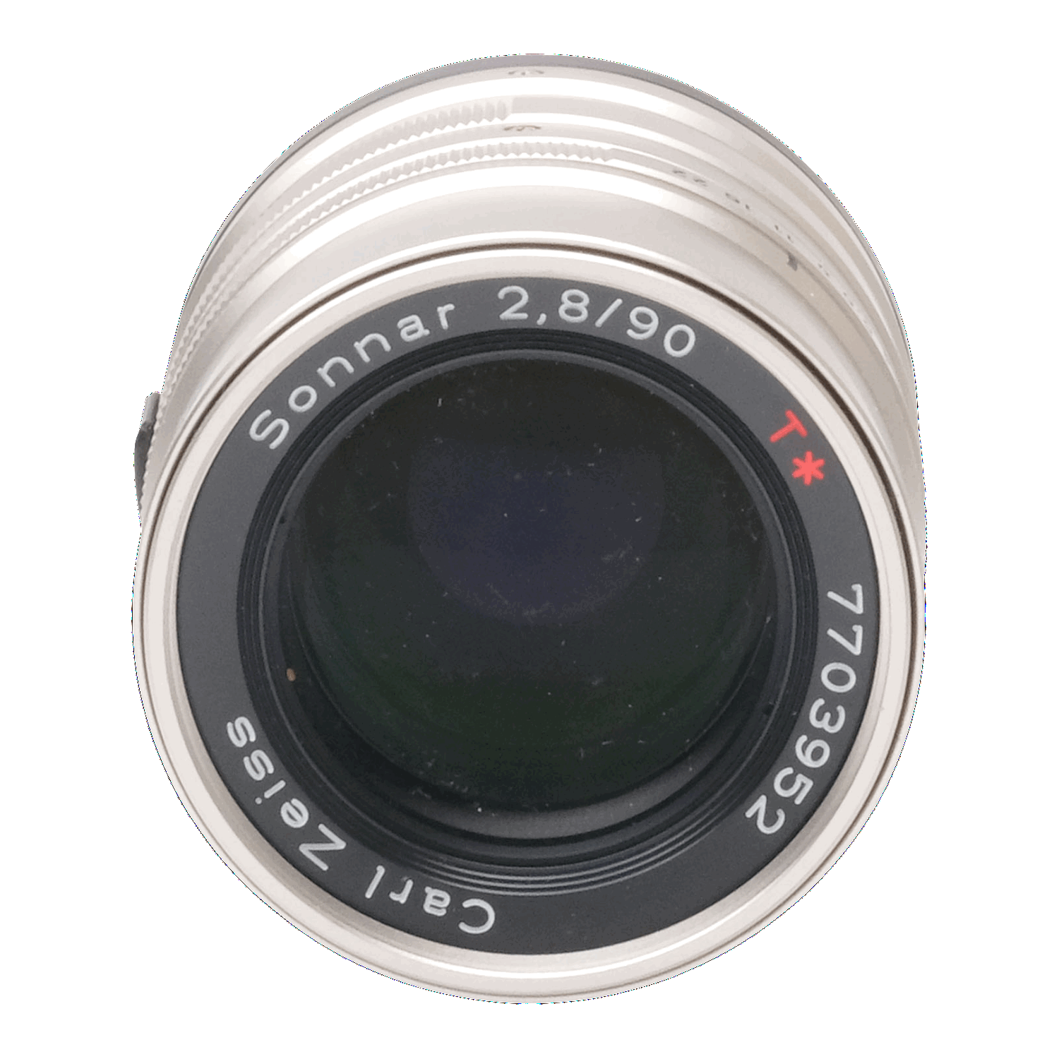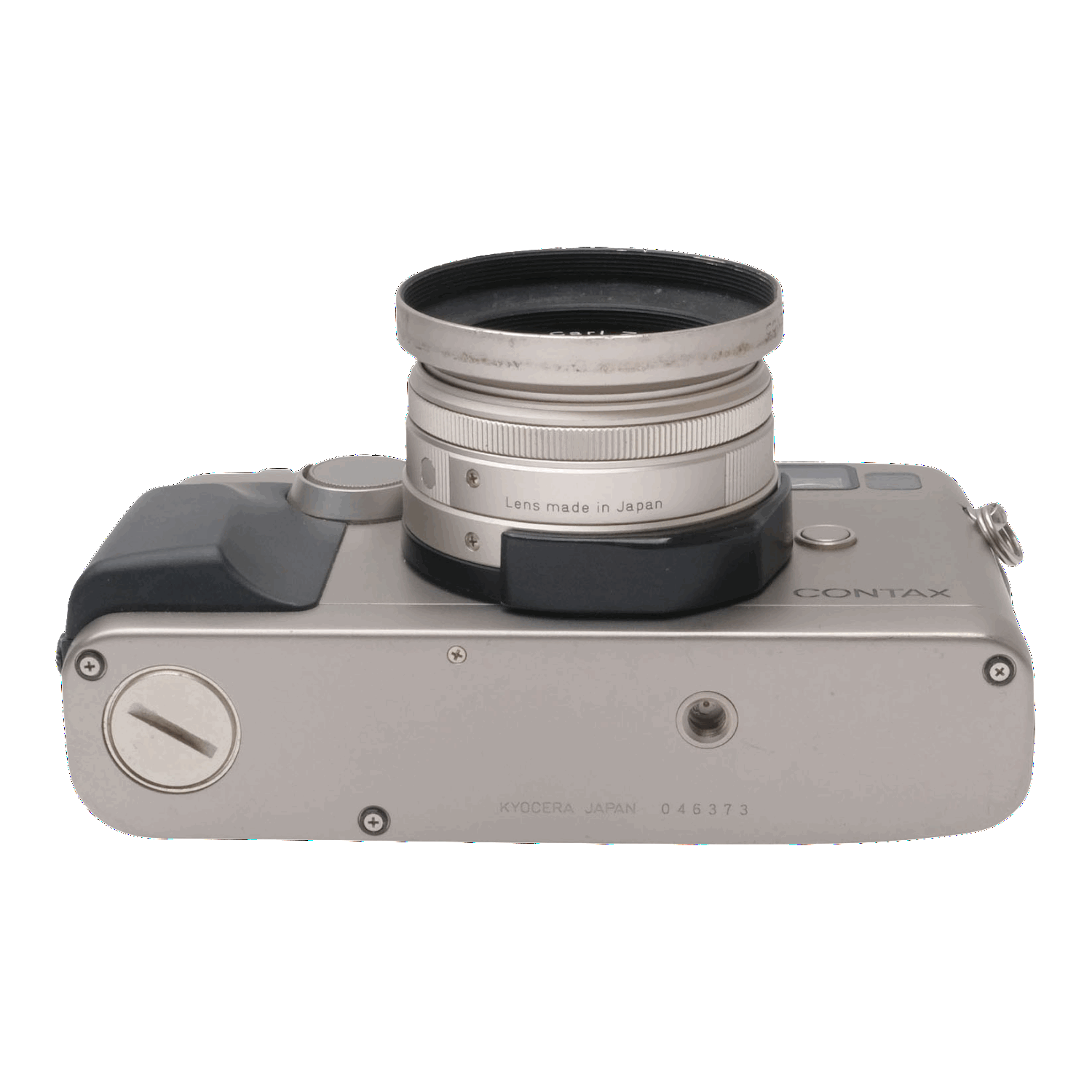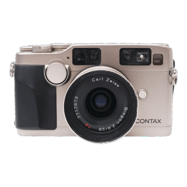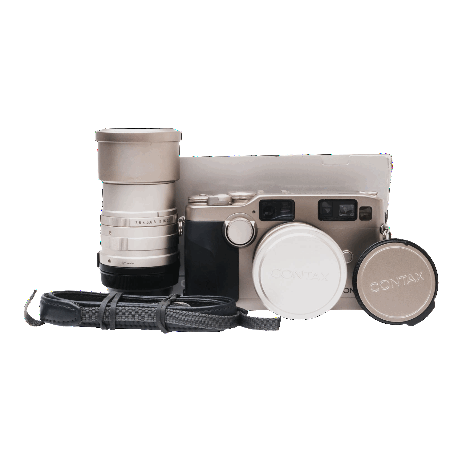 This Contax G2, #046373, is in good condition with some handling wear. I rate it cosmetically an (8+). The camera is in proper working order; film advances properly, the viewfinder is clear, the shutter is accurate at all speeds, the focus wheel is smooth, the meter functions, and the battery compartment is corrosion-free. The included Contax 28mm f2.8 Biogon T*, #7717673, and Contax 90mm f2.8 Sonnar T*, #7703952, are in similar condition, also rated an (8+). The aperture rings are smooth, the apertures function properly, and the glass is clean and clear with no haze, marks, or fungus. There are a few faint specks of dust inside, but they do not affect image quality. This camera also includes a neck strap, lens hoods with front covers and rear caps for both lenses, a body cap, and the original instructions & box for the camera body. The camera uses two (2) 3V batteries (not included). Please refer to the photos for details.