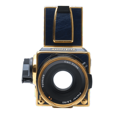 This Hasselblad 503CX (Gold & Blue, 50 Year Anniversary Edition), #01EV10135, is in great condition with minor handling wear. I rate it cosmetically a (9+). The camera is in proper working order; it winds & fires and the crosshair focusing screen has some faint marks, but is otherwise clear. The included waist-level finder in matching gold & blue opens & closes and the magnifier is clear. The included Hasselblad CF 80mm f2.8 Planar T* lens, #7208069, is in similar condition, also rated a (9+). The aperture and shutter speed rings are smooth, but the focus ring is a bit stiff. The aperture functions properly and the shutter is accurate at all speeds. The glass is clean and clear with no haze, marks, or fungus. There are a few faint specks of dust inside, but they do not affect image quality. It has a gold ring on the front. The included Hasselblad A12 Type III film back, also gold & blue, #03EV10126, is rated a (9+). Film advances properly and the film holder has a matching serial number. This listing also includes a front lens cap, but no rear lens cap or covers for the body or back. The kit was CLA'd in Winter 2025. Please refer to the photos for details.