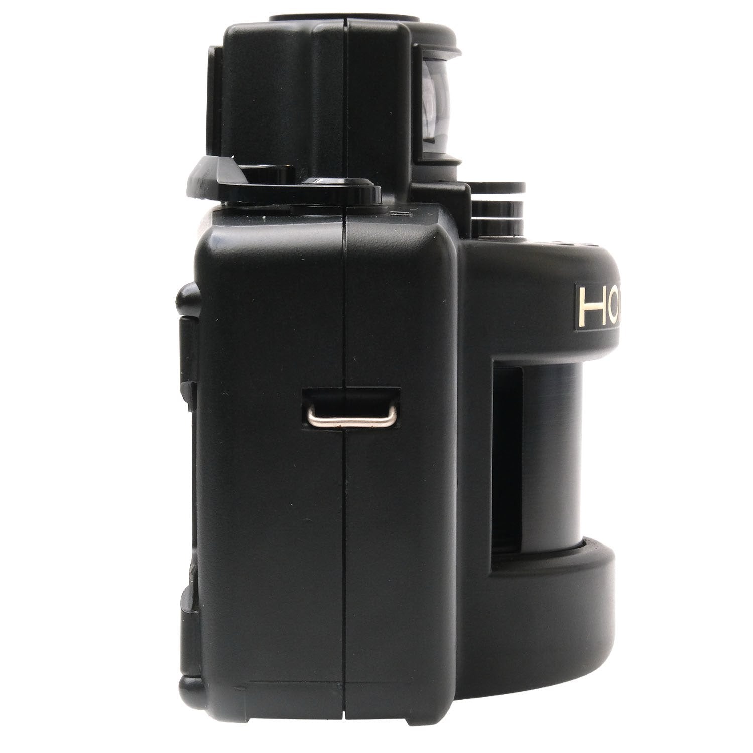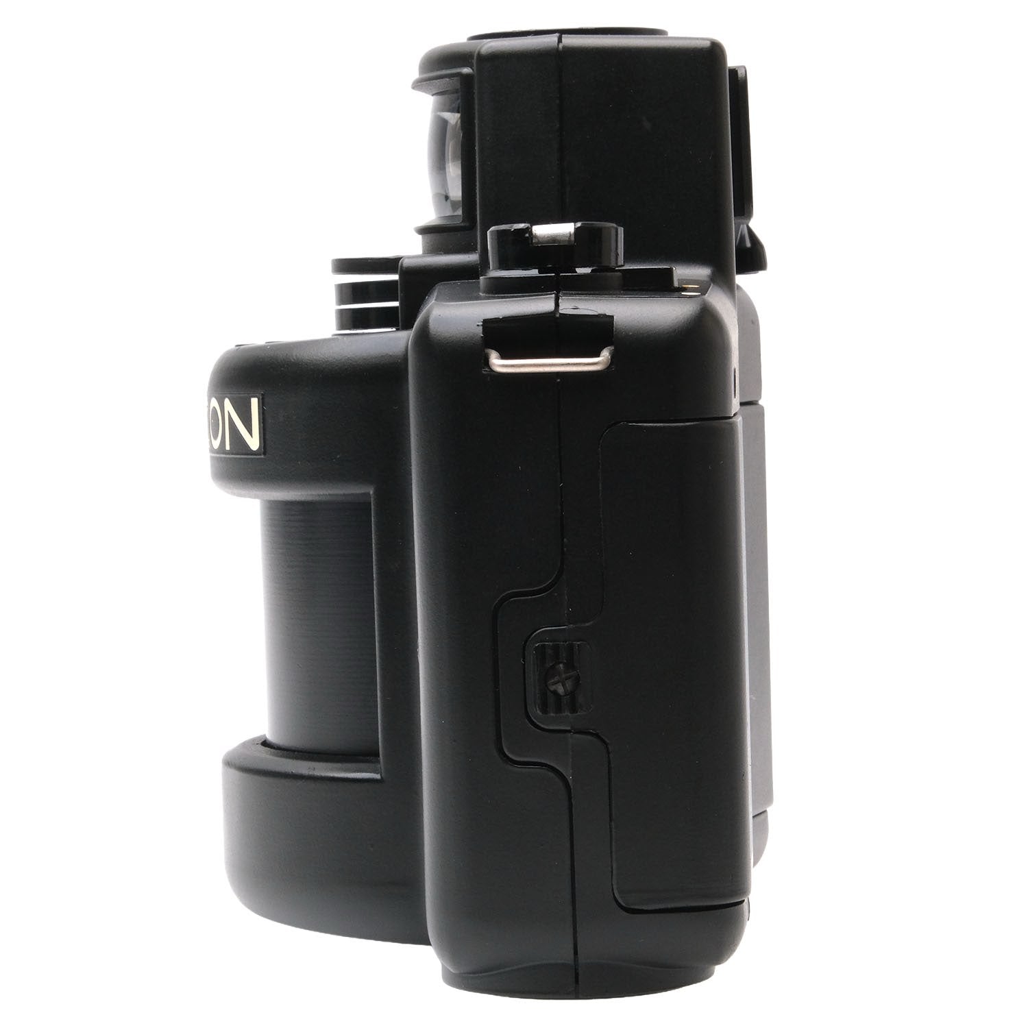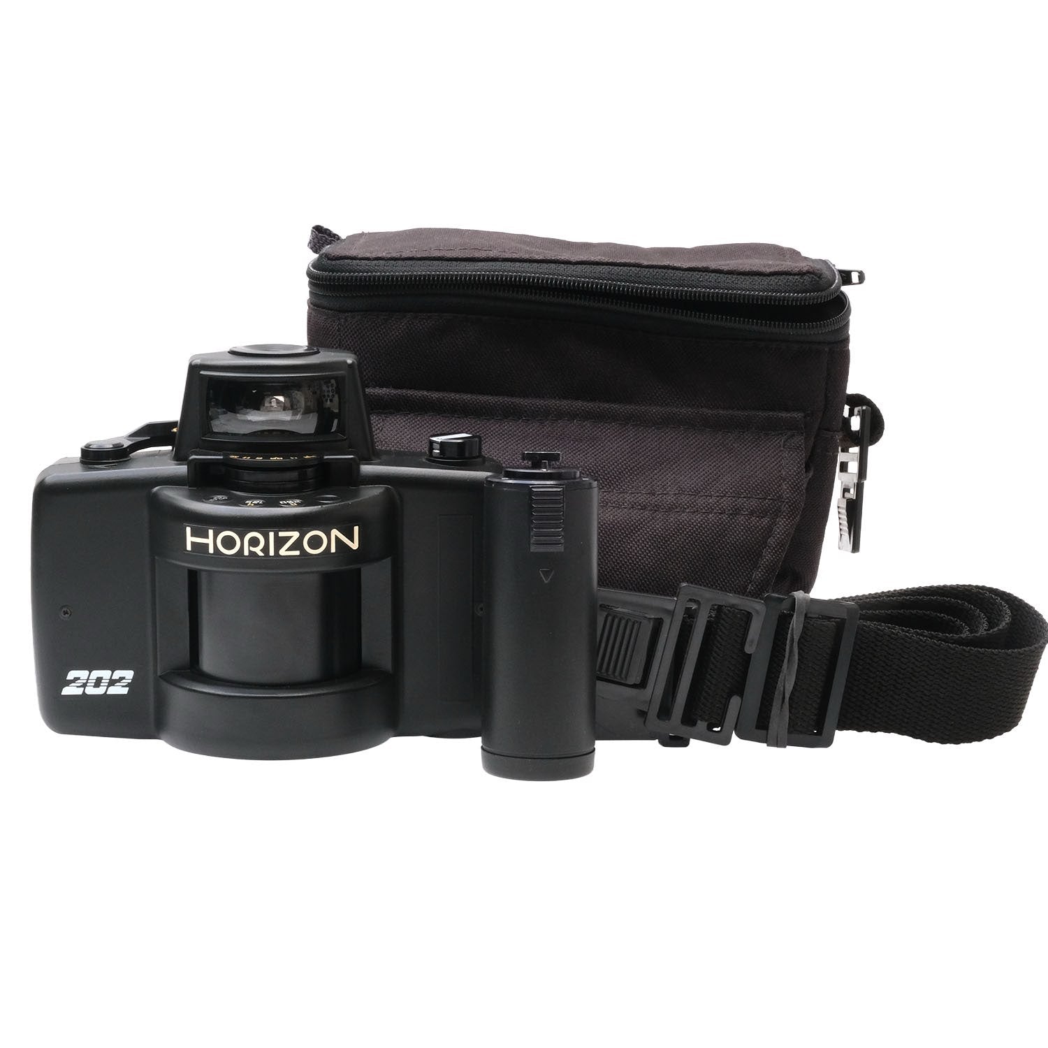 This Horizon 202, #014611, is in great condition with minor handling wear. I rate it cosmetically a (9). The camera is in proper working order; film advances properly, the viewfinder is clear, the shutter is accurate at all speeds, and the aperture functions properly. The built-in 28mm f2.8 MC lens is clear. This cemar also includes a handle and a carrying case with a strap. Please refer to the photos for details.