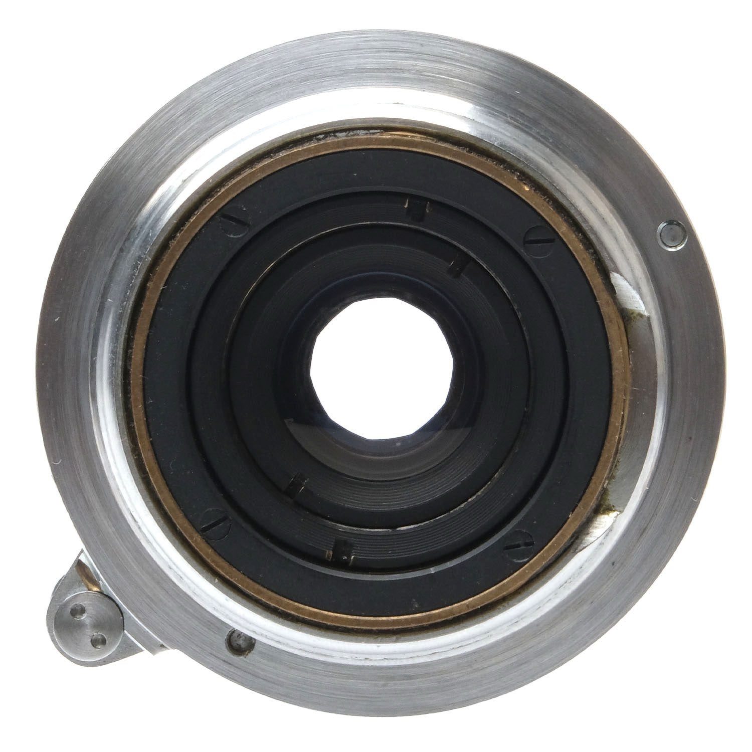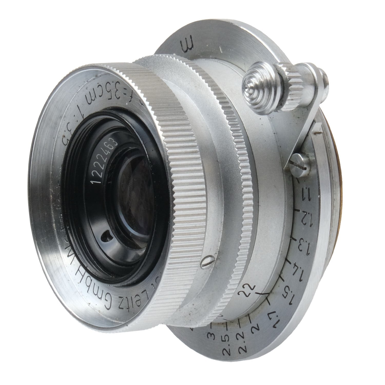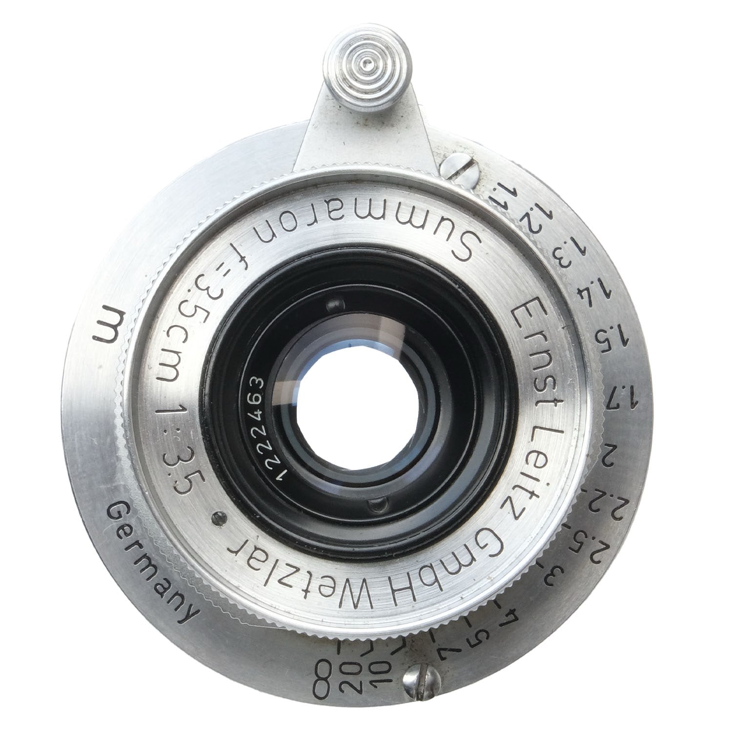 This Leica 3.5cm f3.5 Summaron Lens (Silver), #1222463, is in great condition with minor handling wear. I rate it cosmetically a (9+). The focus and aperture rings are smooth, the aperture functions properly, and the glass is clean and clear with no haze, marks, or fungus. There are a few faint specks of dust inside, but they do not affect image quality. This lens is for Leica screw mount/thread mount (LTM) and other E39 bodies. It includes front & rear caps.