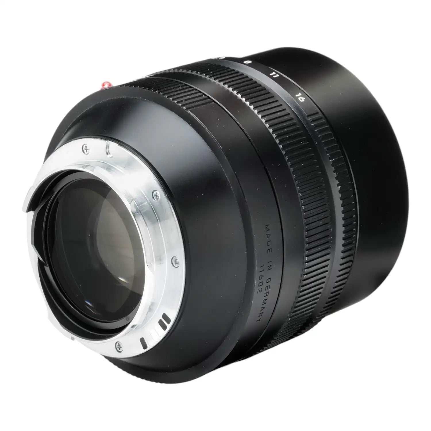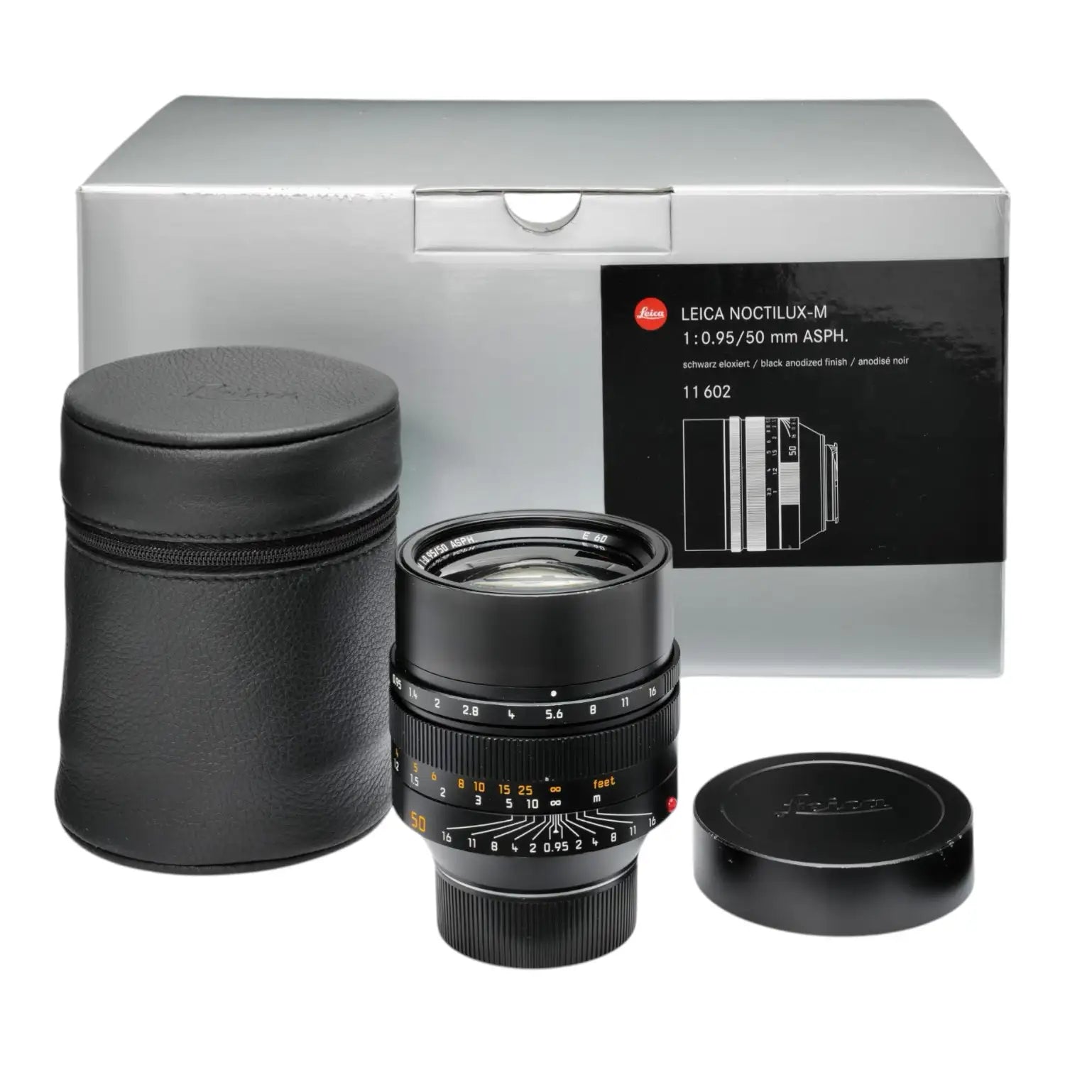 This Leica 50mm f0.95 Noctilux-M Asph Black 11602, #4241075 is in good condition with normal edge wear, mostly on the front rim of the lens shade. I rate it cosmetically at (8+). The focus is smooth and the aperture works properly. The glass is clean and clear with no haze, marks or fungus. This lens comes with both caps, leather case and original box.