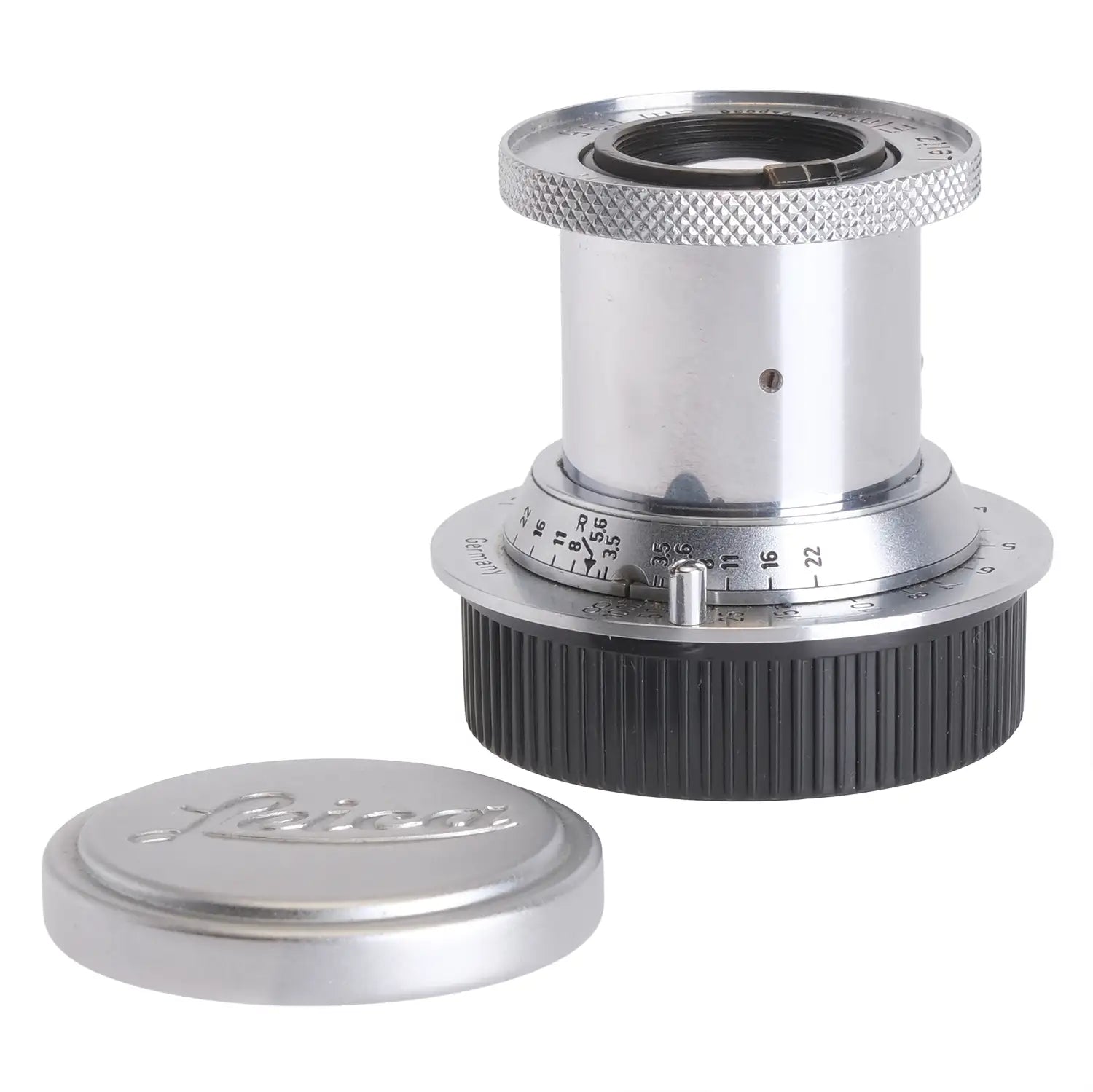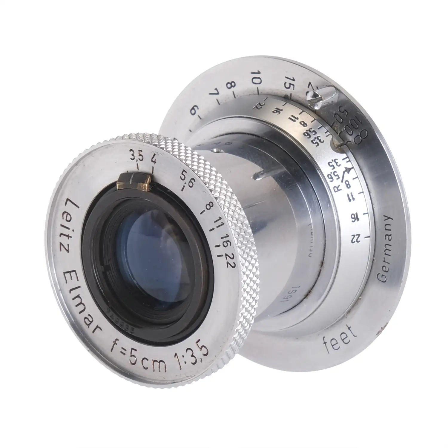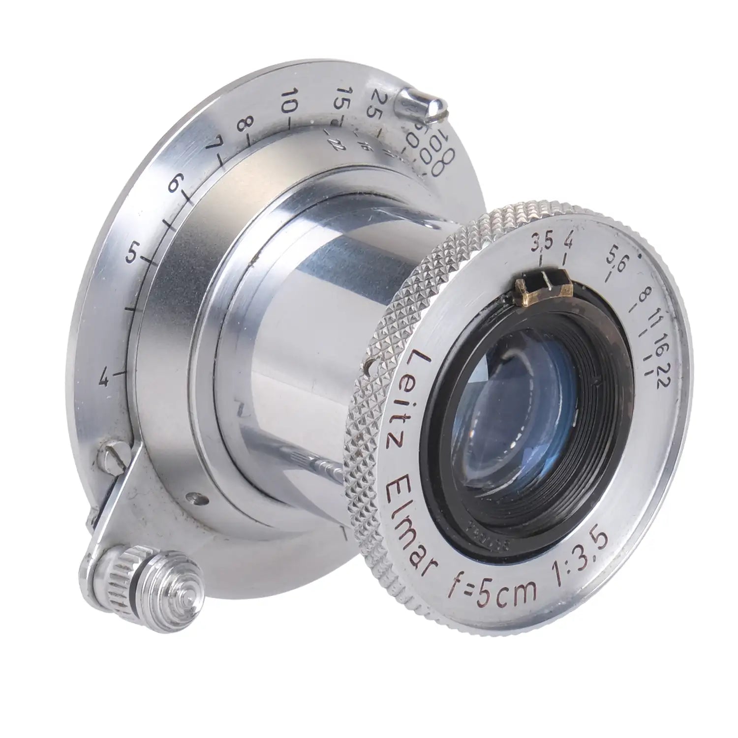 This Leica 5cm f3.5 Elmar SM Lens #749936, is in very good cosmetic condition with minor signs of handling wear found throughout, please see photos for visual reference. Cosmetically, this lens has been rated at a (9) condition. This lens is in proper working order; the aperture tab and focus turn smoothly, and the glass has faint haze which should not affect image quality. There are no signs of fungus or marks present. This lens comes with a front can rear cap only. This lens is ready for use!