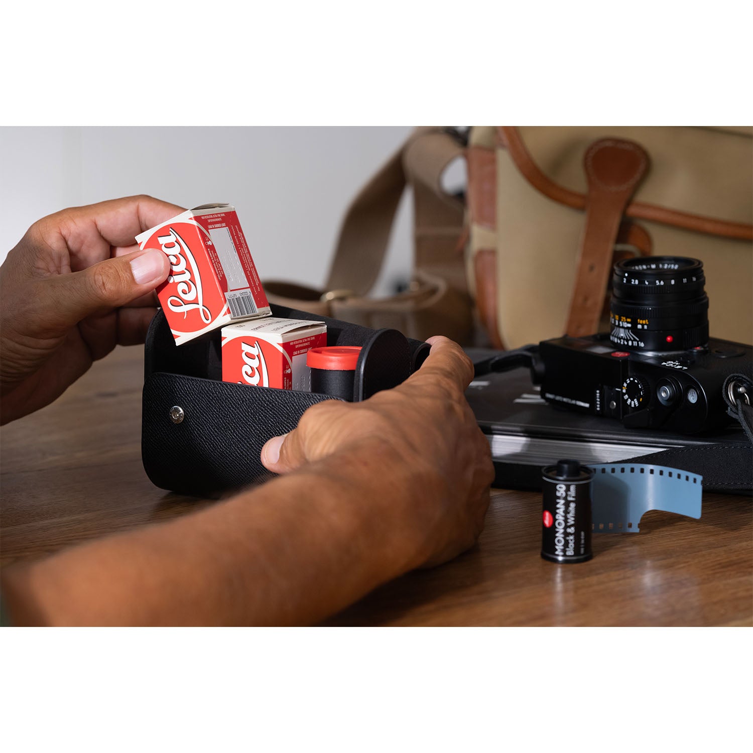 The Leica Film Roll Holder is a timeless companion for enthusiasts of analogue photography. It offers space for three SD cards, two film rolls – stylish, reliable and high-quality.