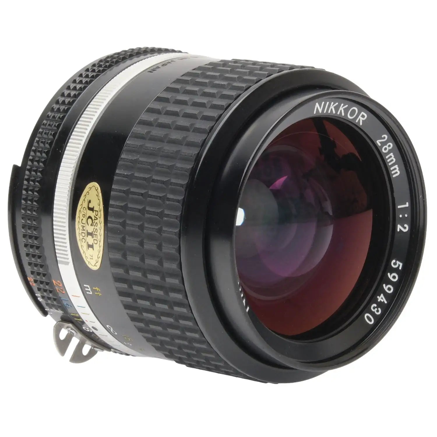 This Nikon AI-S 28mm f2 Nikkor Lens, #599430, is in great condition with minor handling wear. I rate it cosmetically a (9). The aperture ring is a bit jerky and the focus ring is a bit stiff. The aperture functions properly and the glass is clean and clear with no haze, marks, or fungus. There are a few faint specks of dust inside, but they do not affect image quality. This lens includes front & rear caps. Please refer to the photos for details.