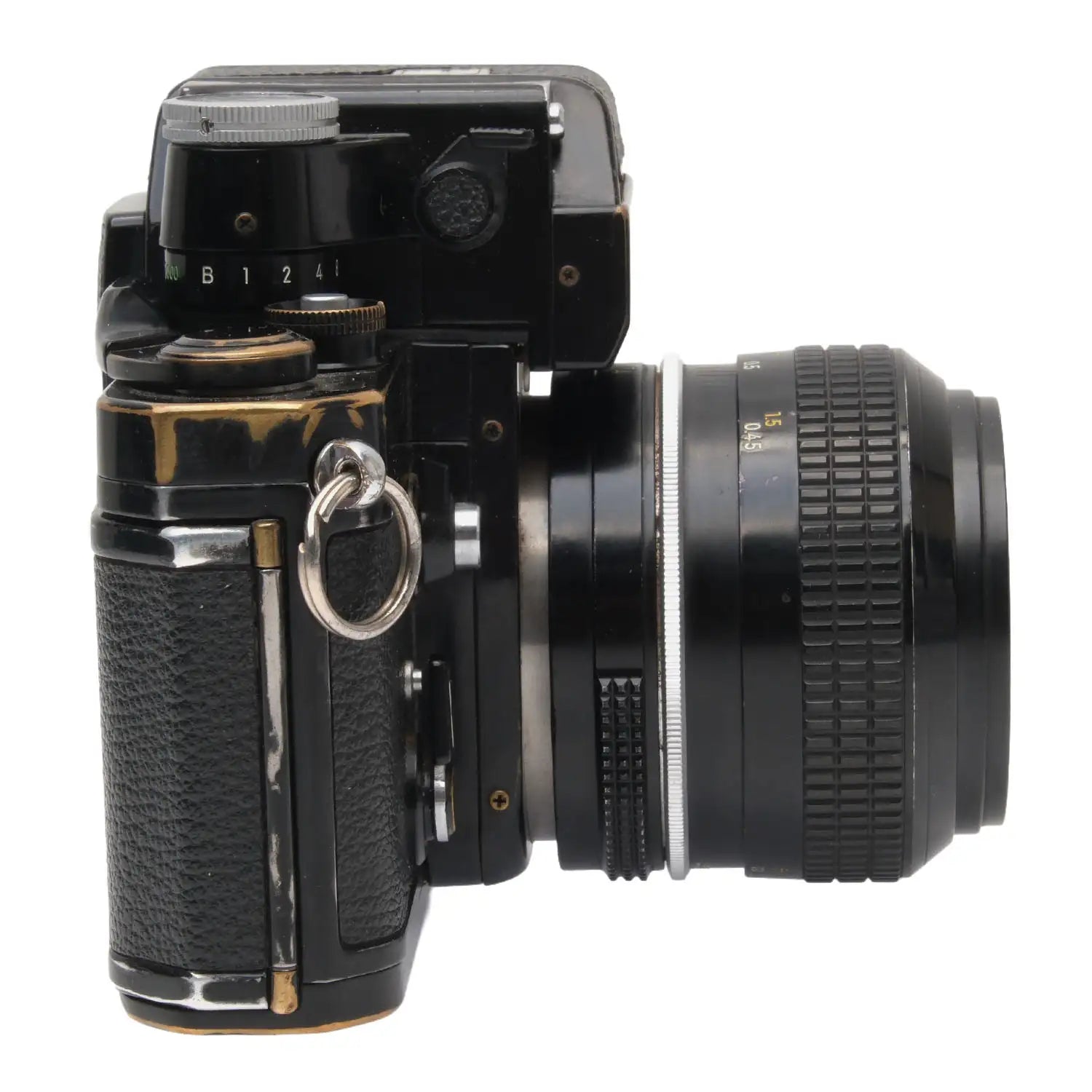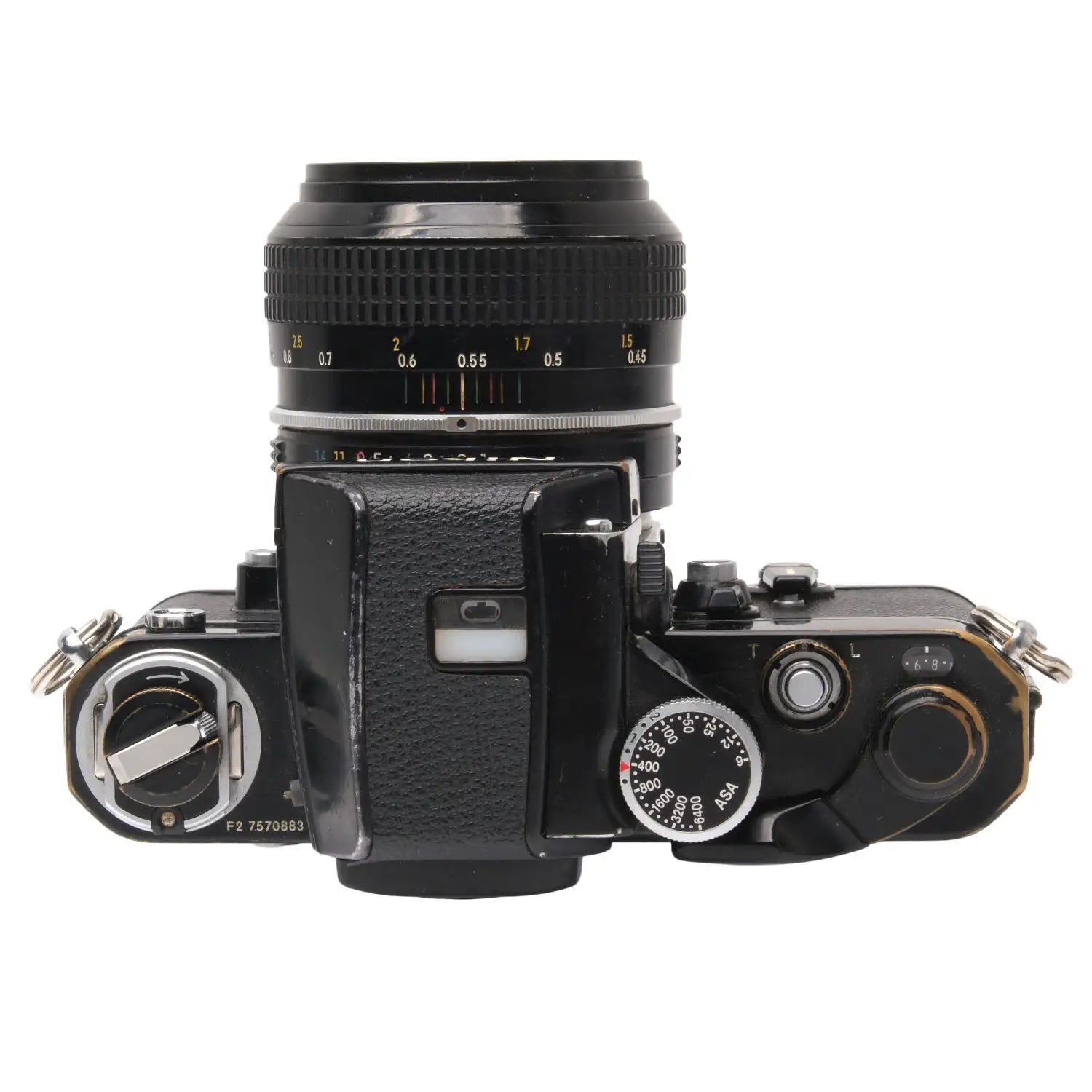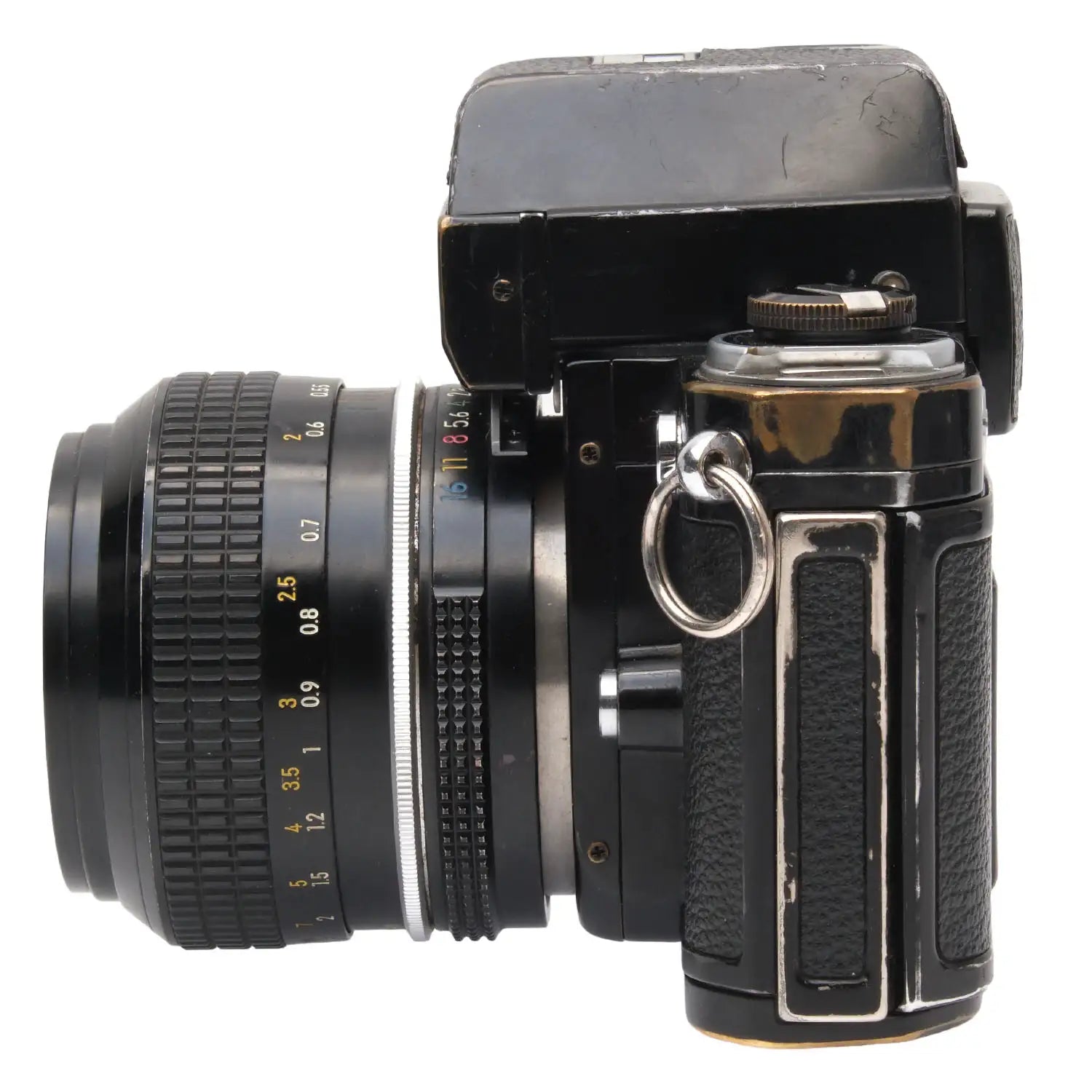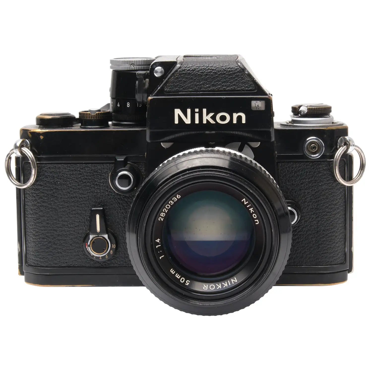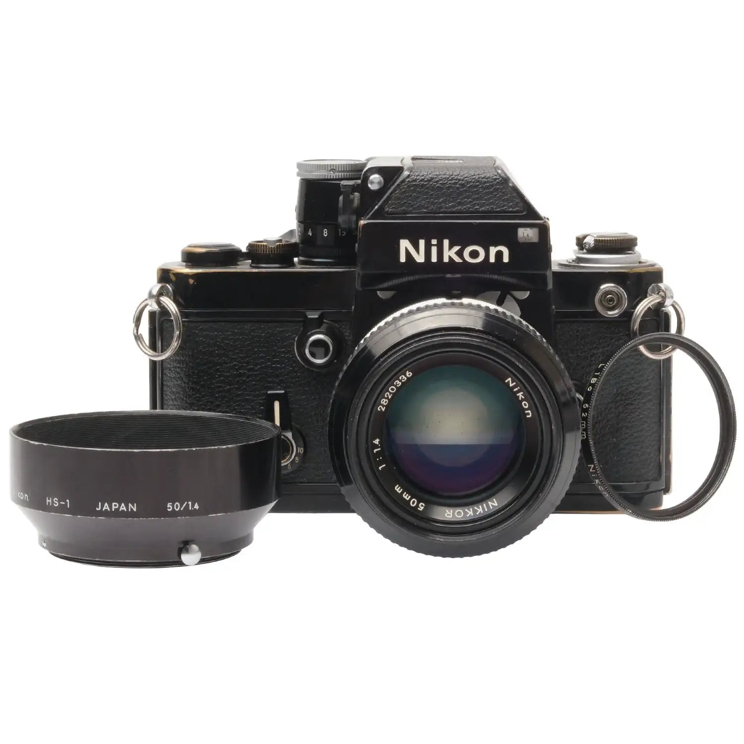 This Nikon F2 (Black), #7570883, is in good condition with some handling wear. I rate it cosmetically an (8+). The camera is in proper working order; film advances properly, the shutter is accurate at all speeds, the focusing screen is clear, and the self-timer functions. The included Nikon DP-1 meter prism finder, #306082, is also rated an (8+). The glass is clear and the meter functions. The included Nikon Non-AI 50mm f1.4 Nikkor Lens, #2820336, is in similar condition, also rated an (8+). The aperture ring is smooth, but the focus ring is a bit loose. The aperture functions properly and the glass is clean and clear with no haze, marks, or fungus. There are a few faint specks of dust inside, but they do not affect image quality. This listing includes a Nikon L1Bc filter and a lens hood, but no lens caps or body cap. It uses either two (2) 1.5V batteries or one (1) 3V battery (not included). Please refer to the photos for details.