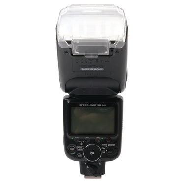This Nikon Speedlight SB-900 Flash, #2427125, is in great condition with minor handling wear. I rate it cosmetically a (9). The flash is in proper working order and ready to be used; it fires and the battery compartment is corrosion-free. This flash includes a Nikon case, a tabletop stand, two diffusers, and a set of color filters. It uses four (4) AA batteries (not included). Please refer to the photos for details