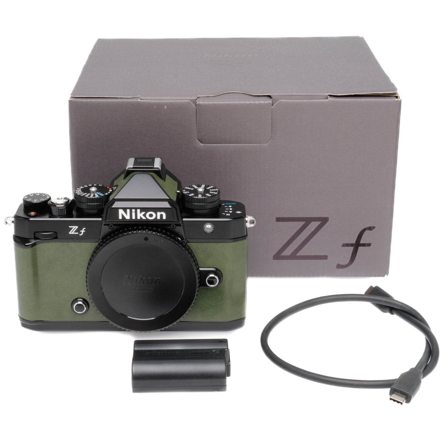 This Nikon Zf Green body is in excellent cosmetic condition with faint handling wear found throughout; please see photos for visual reference. Cosmetically, this camera has been rated at a (9+) condition. This camera is in proper working order; the sensor is clean and unmarked, the memory card slots read and write correctly, and all buttons and dials function properly. This camera includes the box, battery, charging cable and body cap.