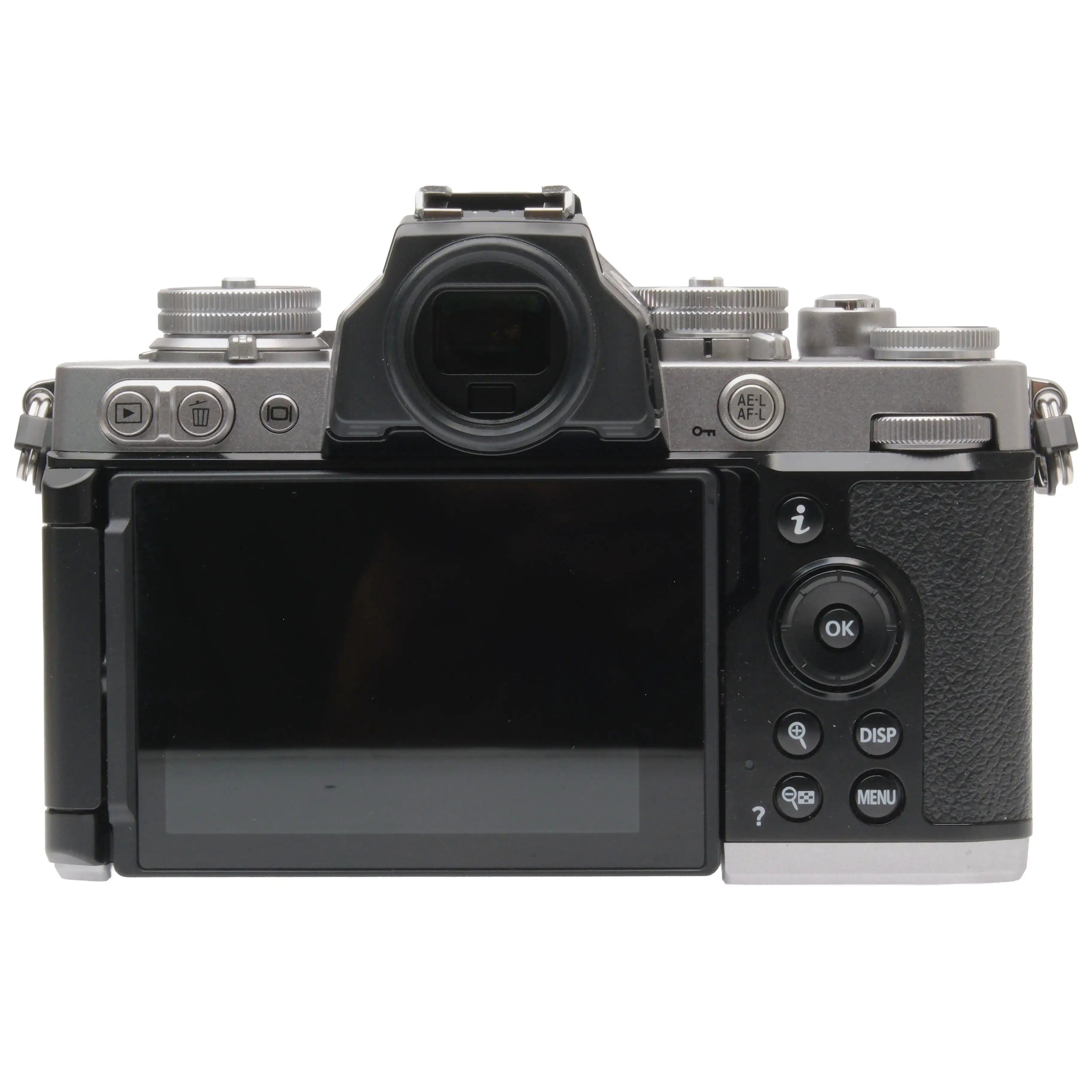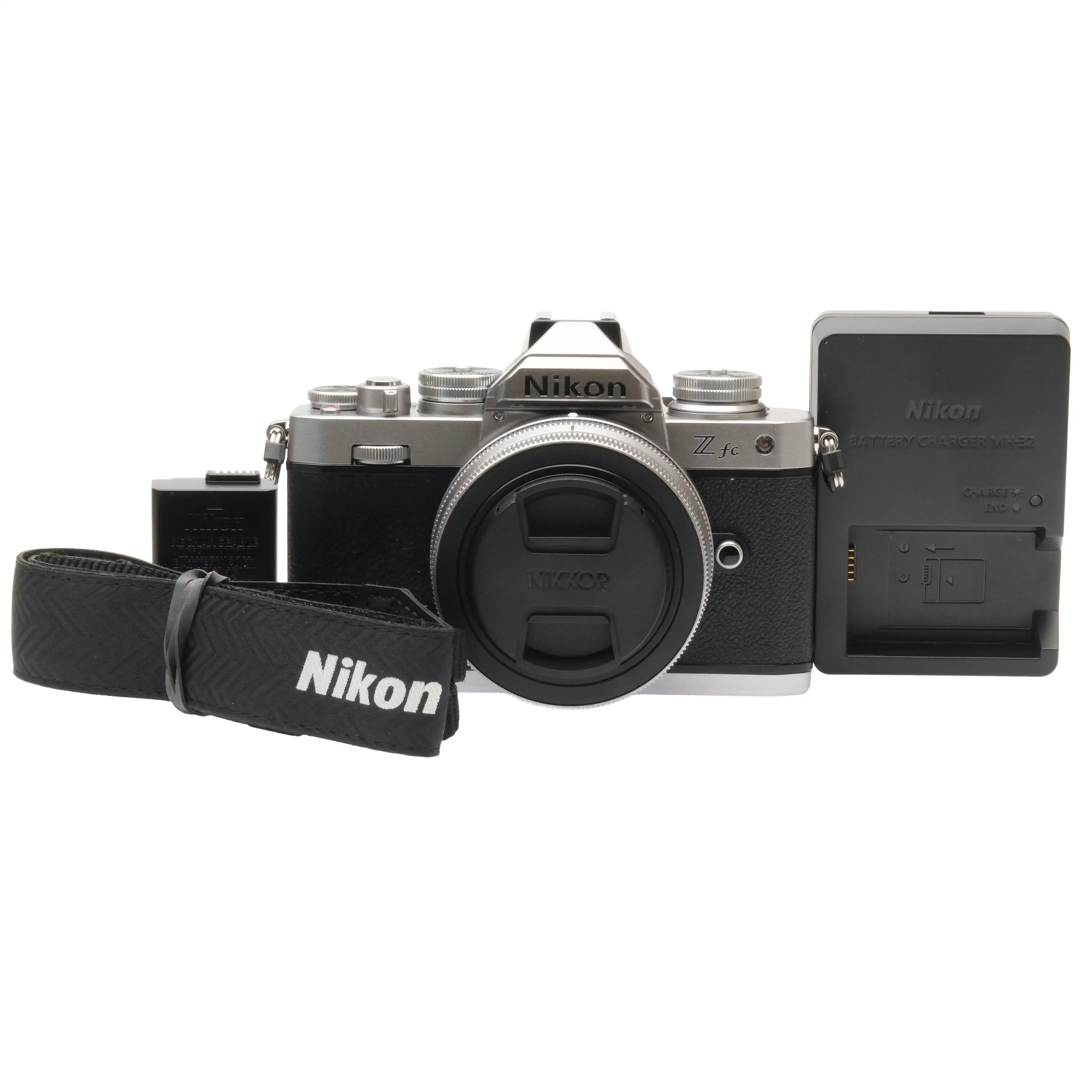 This Nikon Zfc (Silver), #3046017, is in great condition with minor handling wear. I rate it cosmetically a (9+). It has approximately 100 shutter actuations. The camera is in proper working order; the viewfinder is clear, the sensor is unmarked, and the memory card slot reads & writes. The included Nikon Z 16-50mm f3.5-6.3 VR DX Zoom Lens, #30164169, is in similar condition, also rated a (9+). The lens extends and retracts properly, but the focus and zoom rings are a bit stiff. The autofocus and aperture function properly, and the glass is clean and clear with no haze, marks, or fungus. There are a few faint specks of dust inside, but they do not affect image quality. This camera includes a Nikon battery, battery charger, neck strap, and front lens cap, but no rear lens cap or body cap. Please refer to the photos for details.