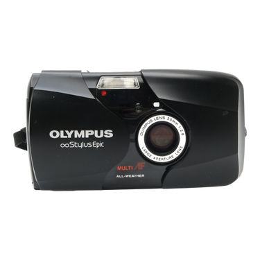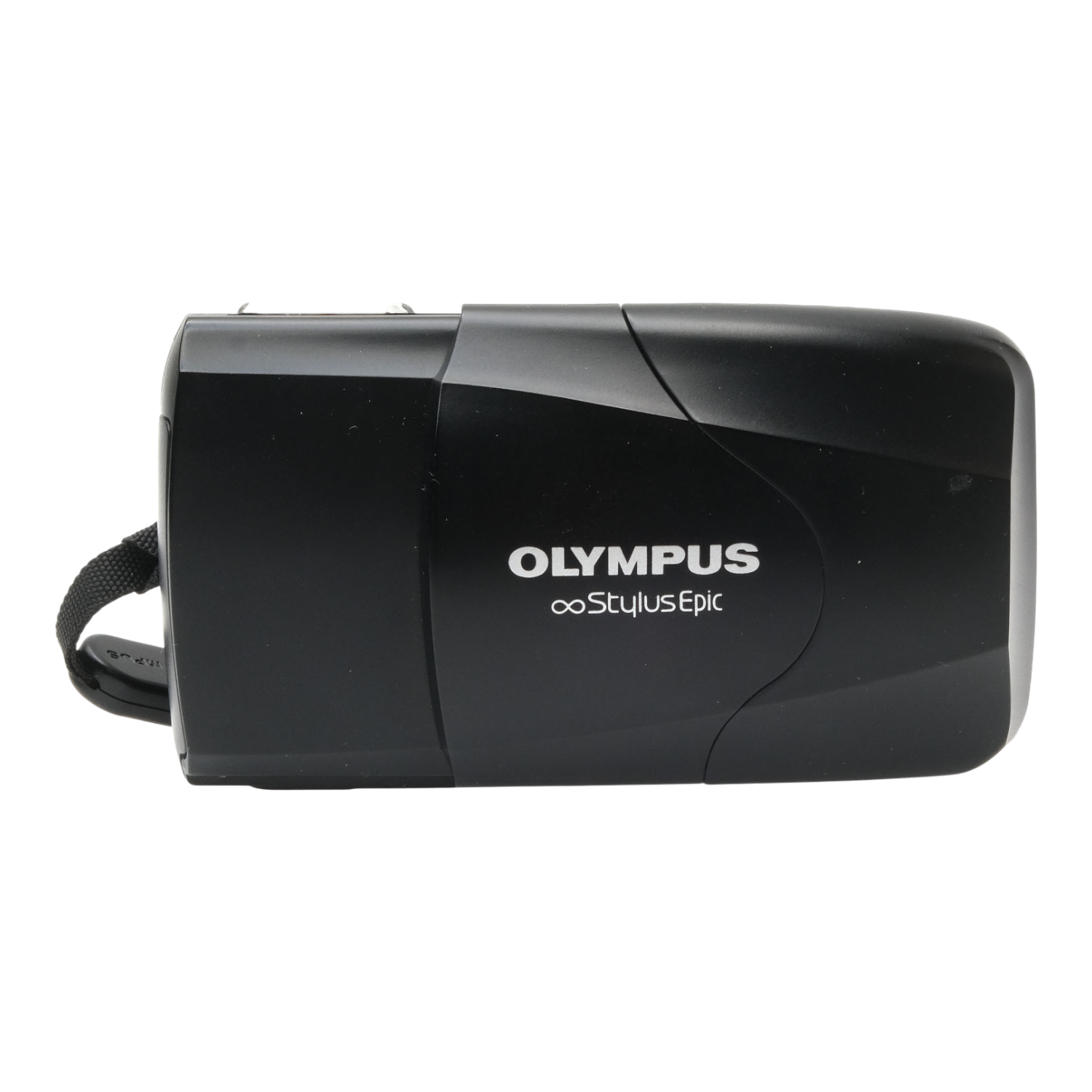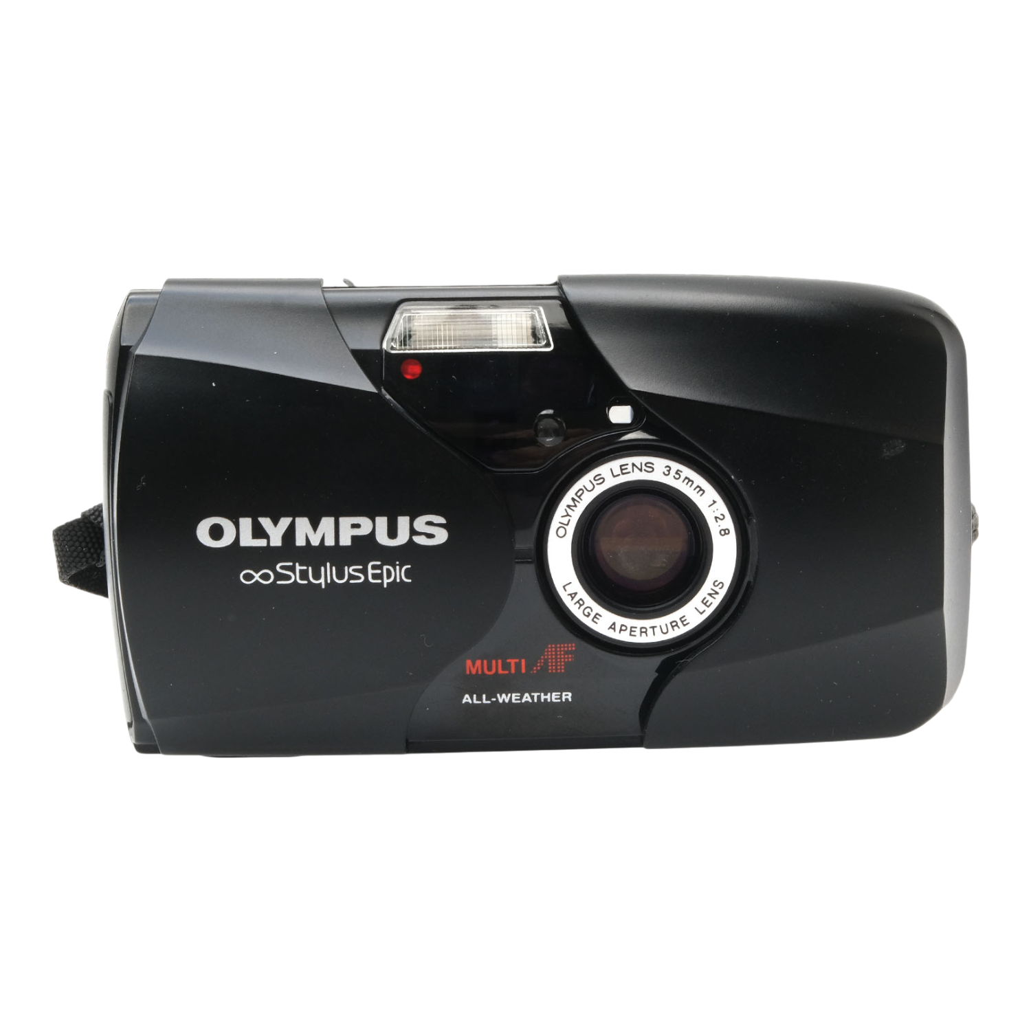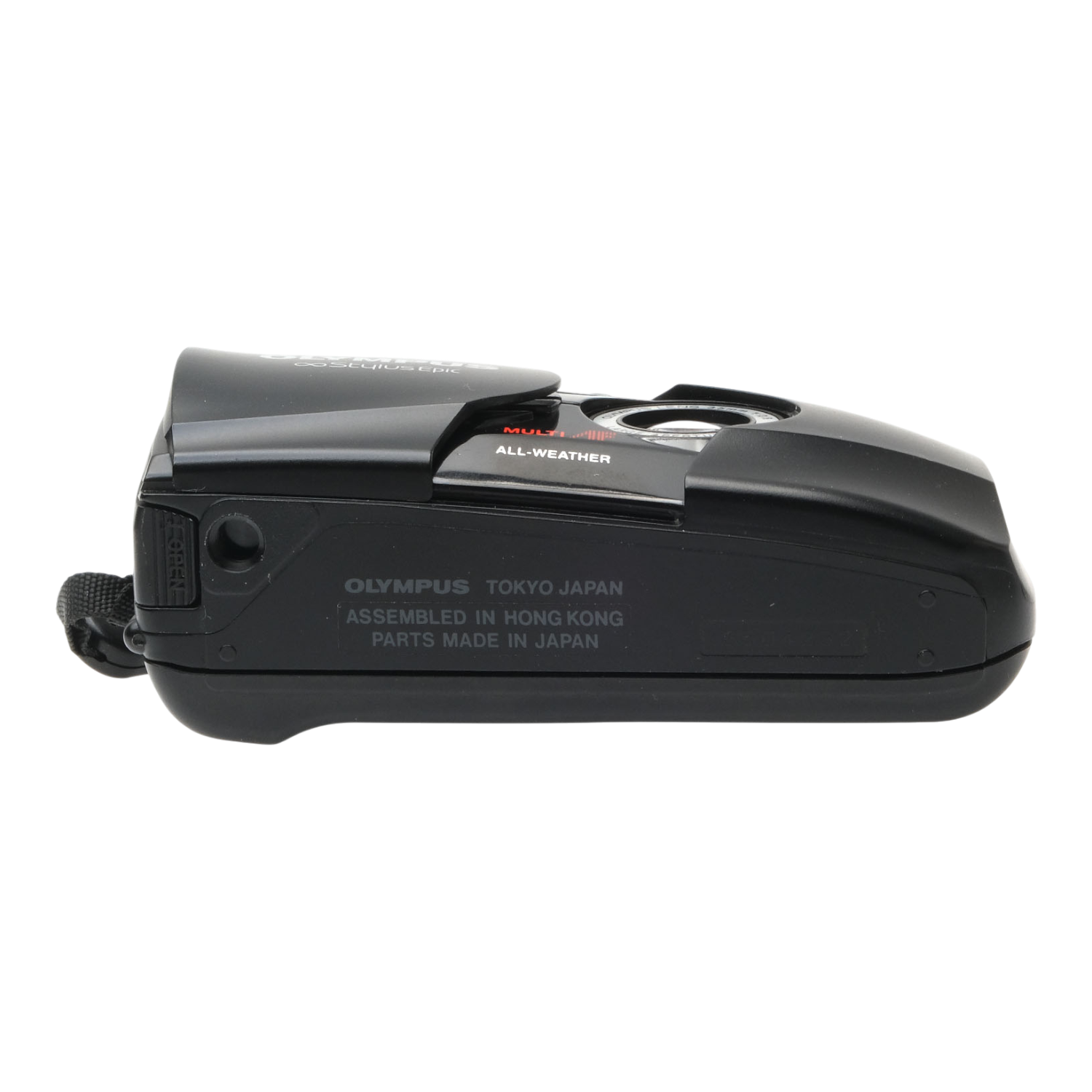 This Olympus Stylus Epic (Black), 6504232, is in great condition with minor handling wear. I rate it cosmetically a (9+). The camera is in proper working order; film advances properly, the viewfinder is clear, the electronics function, and the battery compartment is corrosion-free. The built-in Olympus 35mm f2.8 lens extends and retracts properly. The autofocus and aperture function and the glass is clean and clear with no haze, marks, or fungus. There are a few faint specks of dust inside, but they do not affect image quality. This camera includes an Olympus lanyard. It uses one (1) 123A battery (not included). Please refer to the photos for details.
