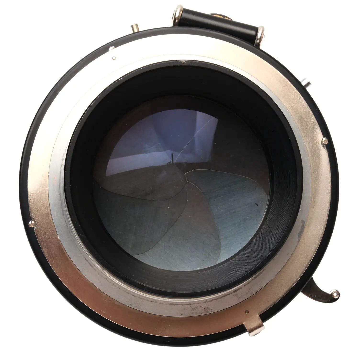 This Rodenstock 300mm f5.8 Imagon Lens, #5065606, is in great condition with minor handling wear. I rate it cosmetically a (9). The glass is clean and clear with no haze, marks, or fungus. There are a few faint specks of dust inside, but they do not affect image quality. The included Compound shutter, #801832, is in similar condition, also rated a (9). The aperture lever is smooth and the aperture functions properly. The shutter fires, but is inaccurate at speeds below 2. This lens includes three f-stop filters, a 4X ND filter, lens hood, front lens cap, lens board, and the original case. The case is deteriorating and the hinges have been taped. No retaining ring or rear lens cap are included. Please refer to the photos for details.