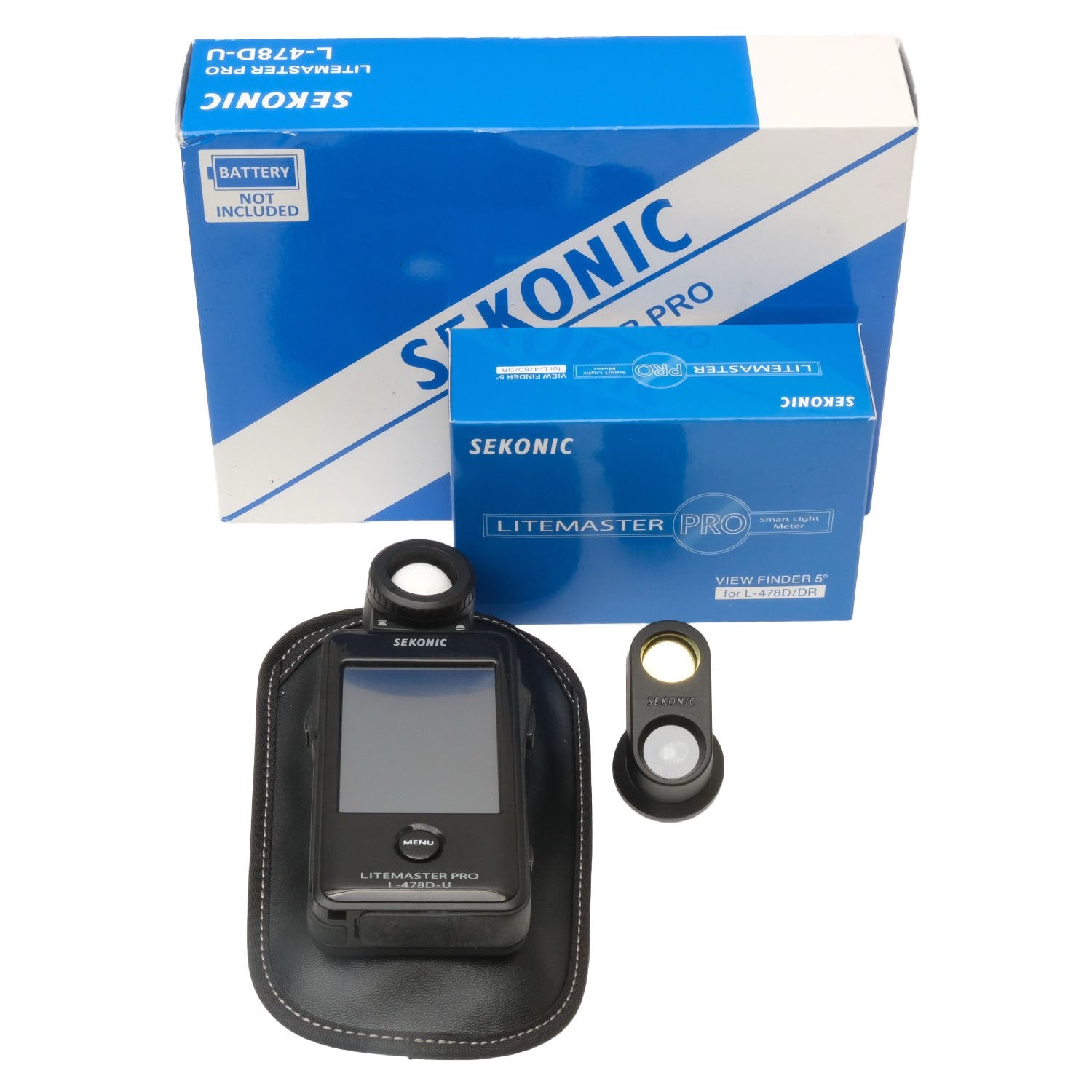This Sekonic Litemaster Pro L-478D-U, #013256, is in great condition with minor handling wear. I rate it cosmetically a (9+). The meter is in proper working order and ready to be used. The included Sekonic VF5 Finder, #013937, is in similar condition, also rated a (9+). The listing includes a leather pouch, lanyard, and neck strap for the meter, and the original instructions & boxes for both the meter and VF5 Finder. The meter uses two (2) AAA batteries (not included). Please refer to the photos for details.